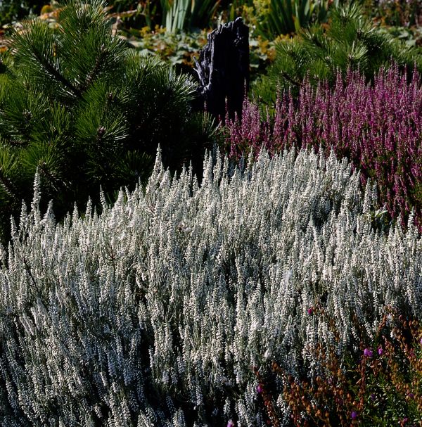In freier Natur ist die winterharte Besenheide (Calluna vulgaris) am weitesten verbreitet, die bis zu 20 Jahre lang ihre Umgebung ziert. Als Zwergstrauch wird sie 30 bis 50 Zentimeter hoch und schmückt sich im Garten je nach Sorte von Juni bis in den November hinein mit einfachen oder gefüllten Blüten. Diese umgibt Laub, das nicht nur in Grün vorkommt, sondern auch gelblich oder silbrig getönt sein kann und sich teilweise sogar im Winter gelb, orange oder tiefrot verfärbt. Dass im winterlichen Garten keinesfalls Tristesse herrscht, verhindert auch die Schneeheide (Erica carnea), die am besten in größeren Gruppen gepflanzt wird und von Dezember bis in den April hinein mit ihren weißen, rosafarbenen, roten oder violetten Blüten erfreut. Weitere Heidepflanzen sind im Sommer die Grauheide (Erica cinerea) und die zierliche Glockenheide (Erica tetralix), im Winter die Englische Heide (Erica darleyensis), die an geschützten Stellen gedeiht und je nach Sorte sogar noch im Mai blüht. Auch Besenheidensorten, die ihre Blütenknospen mit farbigen Kelchblättern umhüllen ohne sie zu öffnen, so genannte Knospenblüher, machen den Winter farbenfroh.