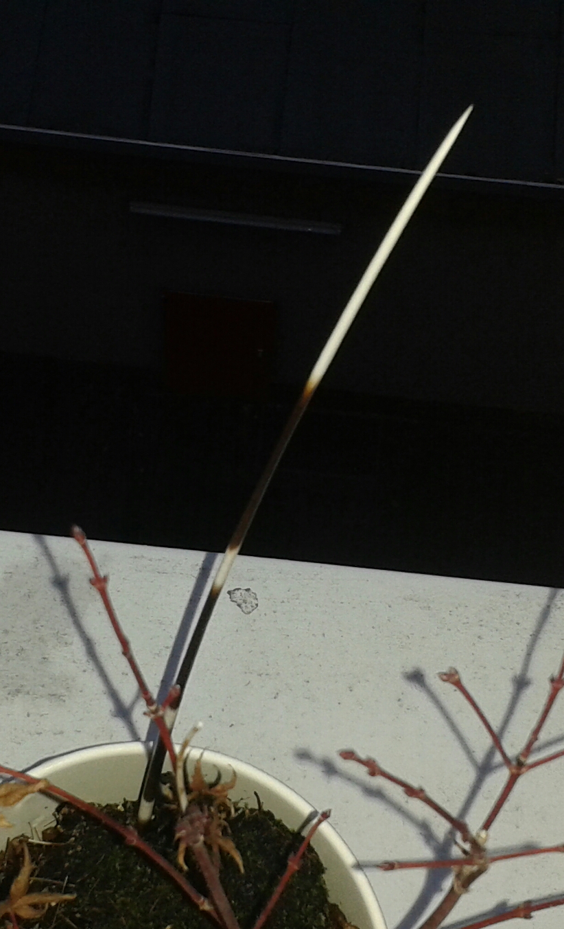 Ca. 25 cm hoher schwarz-weißer Stachel der aus dem Blumentopf auf dem Fensterbrett draußen wächst. (3. Stock in Frankfurt) sieht irgendwie wie ein Mikado Stab oder Stinktier Stachel aus.