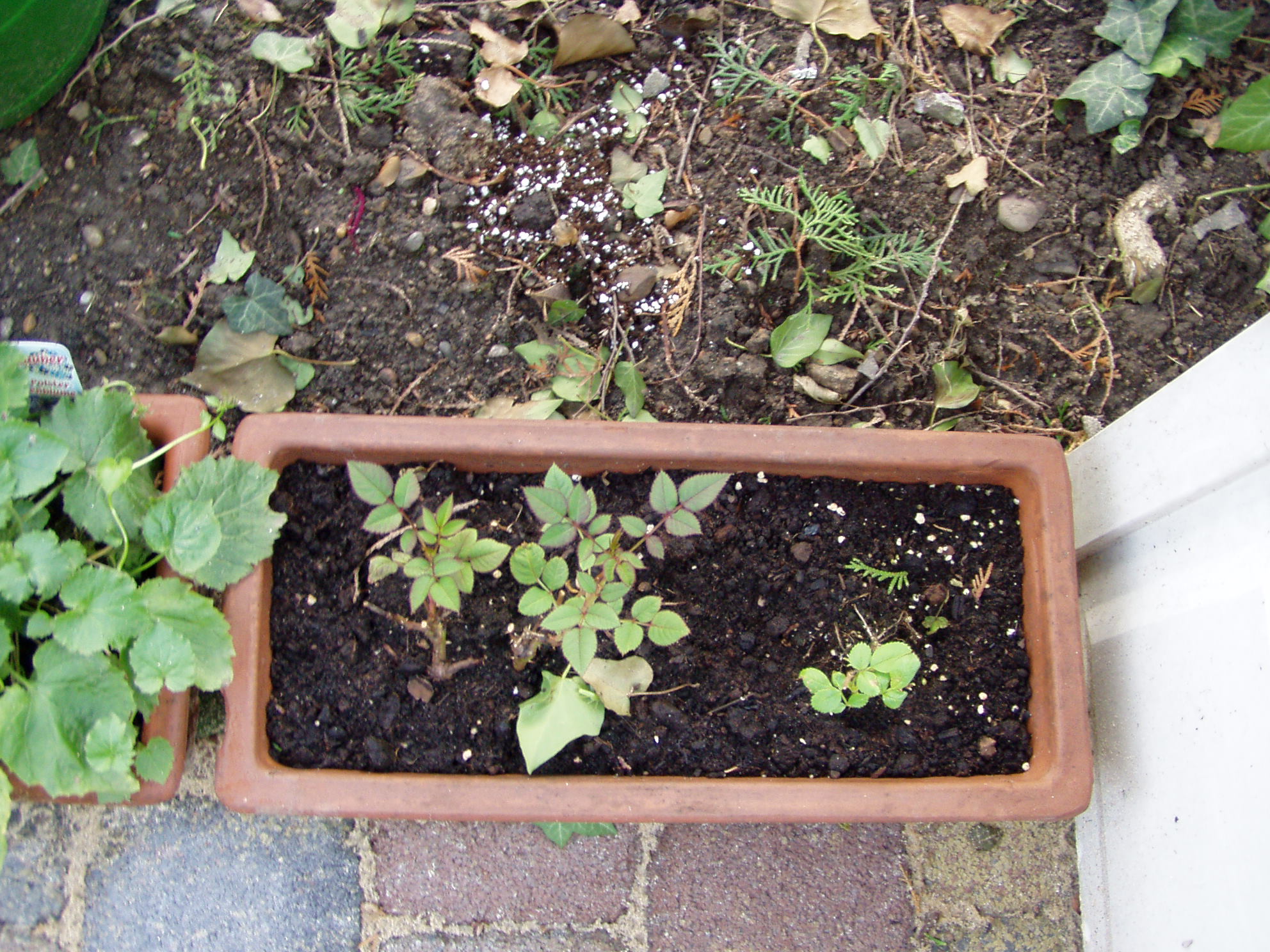 Und jetzt sieht es wieder so aus, links ist das ehemals vertrocknete Röschen, rechts das ist auch irgendeine Rosensorte, keinen Schimmer, wo die her kommt. hat sich in einem anderen Topf, der auf dem Arbeitstisch stand, irgendwie angefunden