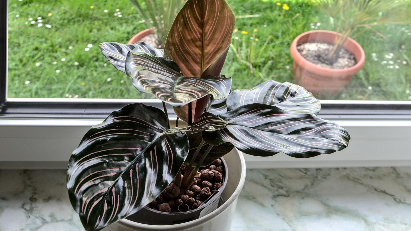 Bedeutet das rosa Blatt bei dieser Calathea ornata, dass sie beim Händler zu hell stand? Bei mir steht sie nun auf der Nordseite im (trockenen ungenutzten) 2. Bad / Heizraum. Ich frage mich, was ich zur Verbesserung des Mikroklimas machen kann. Die Pflanze wird in Hydro gehalten und ich denke mir, vielleicht hilft es da mehrere großblättrige Pflanzen daneben zu stellen.
