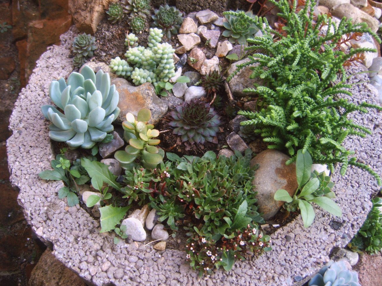 im Sommer habe ich eine Palette mit kleinen Sukkulenten (schreibt man das so?) gekauft, die laut Fachberaterin winterhart sein sollten. Die haben sich auch wunderbar entwickelt. Einige wuchern schon so stark, dass ich sie demnächst mal teilen müsste.