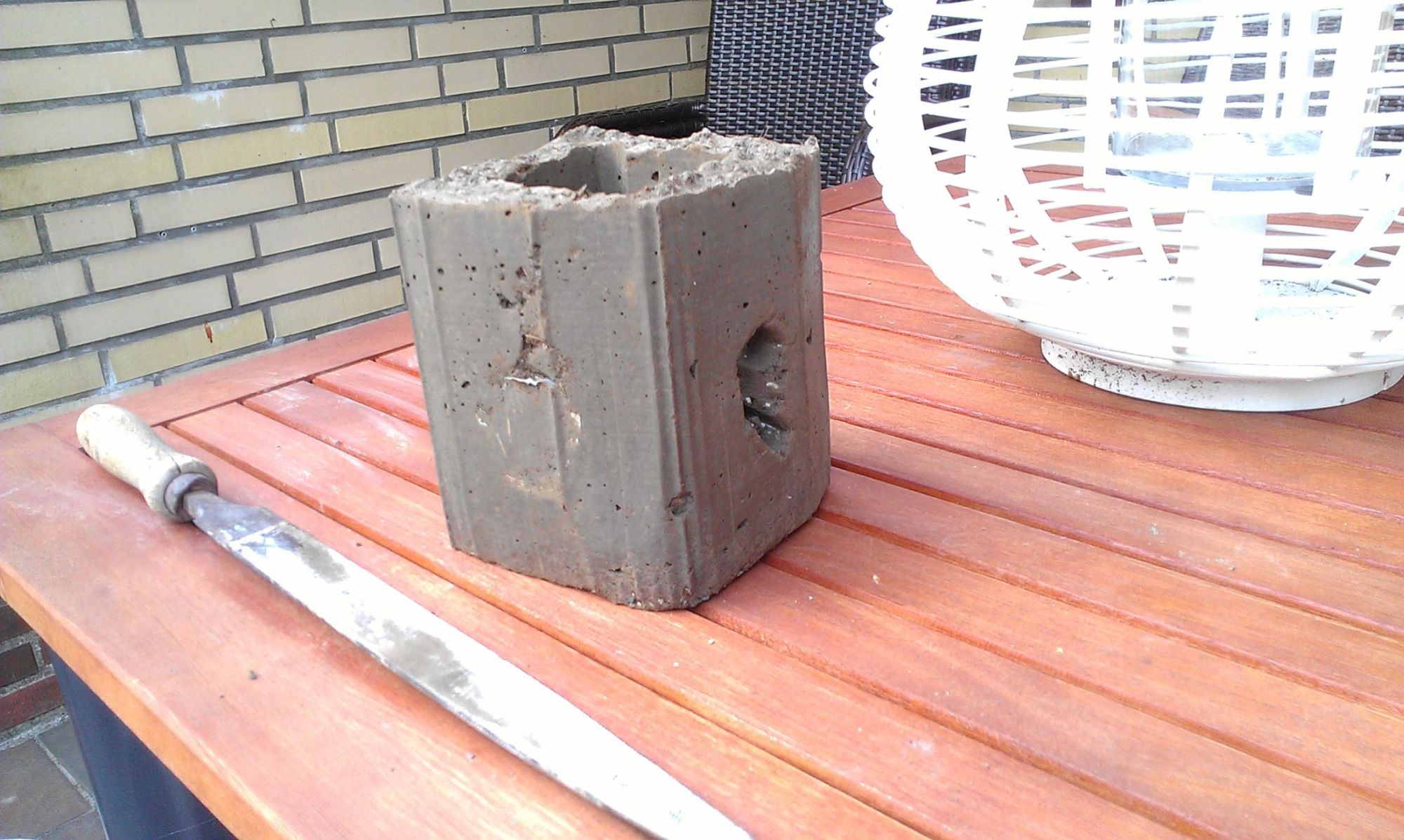 Heute war ich dann neugierig und habe die Formen entfernt. Leider haben sich die Klopapierrollen, die die "Fenster" im Lichtkasten freihalten sollten, trotz Ducktape-Wicklung als nicht ausreichend standfest erwiesen (siehe zweites Bild). Mit brachialer Gewalt mußte ich die Reste entfernen und die Fenster freilegen. Glücklicherweise war der Zement noch nicht endfest. Wie müssen die japanischen Steinmetze bei richtigem Granit erst ackern...