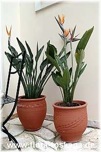 Paradiesvogelblumen (Strelitzia reginae) sind mit ihren orange-blauen Blüten, die an farbenprächtige Vogelköpfe erinnern und viele Wochen halten, wahrhaft paradiesisch. Doch nicht nur sie machen die robusten und langlebigen Stauden zu kostbaren Begleiter auf sommerlichen Terrassen und Balkonen, in Wohnräumen und Wintergärten. Auch ihre bananenartigen Blätter sorgen für tropische Atmosphäre. Sie sind fest, dunkel bis bläulich-grün und bestimmen die Endhöhe einer Paradiesvogelblume: höher als das längste Blatt werden sie nicht (0,8-1,5 m). Dafür bilden sie mit zunehmendem Alter immer mehr Triebe, von denen jeder 2-3 Blüten hervorbringt. Deshalb sagt die Höhe einer angebotenen Strelitzie wenig über ihr Alter aus, sondern vielmehr die Topfgröße und damit Triebdichte. Die Blütezeit wird sehr stark durch die Überwinterung beeinflusst. An dauerwarmen, hellen Winterplätzen in Wohnräumen und Wintergärten öffnen sie sich bereits während der Wintermonate. Bei lichtarmer und kühler Überwinterung in Treppenhäusern, sporadisch beheizten Arbeitsräumen oder auf hellen Dachböden öffnen sie sich erst ab dem Frühjahr und im Sommer, auch wenn oft schon ab November erste Blütenstiele zu sehen sind. Wichtig bei den ausgesprochen pflegeleichten und schädlingsfreien Exoten ist: lieber ein bisschen zu wenig als zu viel pflegen! Nur zu viel Wasser kann den Wurzeln schaden, zu wenig nie. Zu viel Dünger führt zwar zu reichlich neuen Blättern, aber zu weniger Blüten. Wenn eine Strelitzie auch nach Jahren nicht blüht, handelt es sich um Sämlinge, die mindestens 6-7 Jahre bis zur Blühreife benötigen. Sämlinge werden in Gartencentern häufig sehr günstig angeboten, doch kaufen Sie sich damit lange Wartezeiten ein. Unsere Pflanzen sind stattdessen bereits beim Erhalt und in jeder Größe blühfähig, da sie durch Teilung vermehrt werden. Hierbei trennt man eine erwachsene, kräftige Mutterpflanze in mehrere Partien, von denen jede einzelne nach der Anwachsphase sofort blühfähig ist.