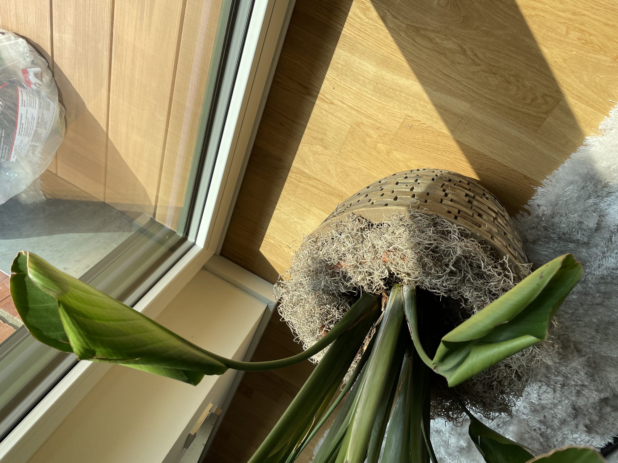 Sie steht direkt an einem Südfenster und bekommt sehr viel Licht. Ich gieße sie einmal die Woche bzw alle 10 Tage mit 1L Wasser und Strelitzien Dünger.