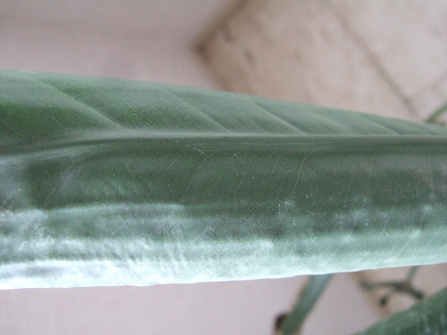 Braune Punkte entlang der Blattmitte auf der Oberseite.