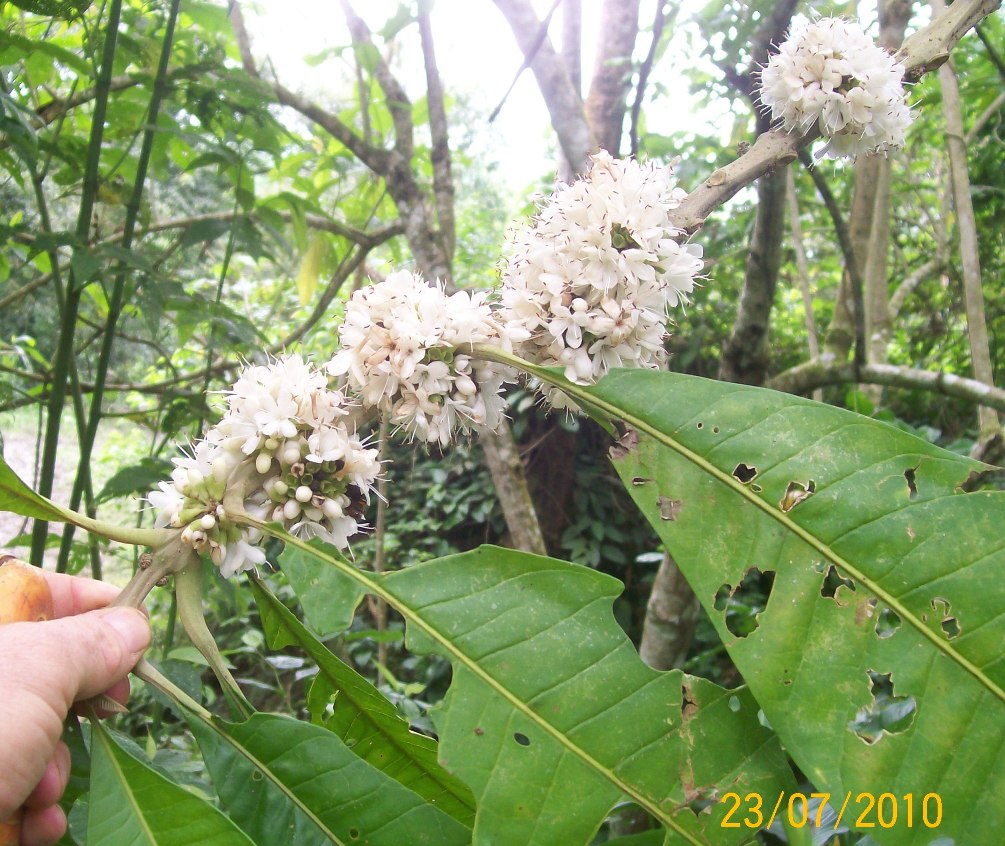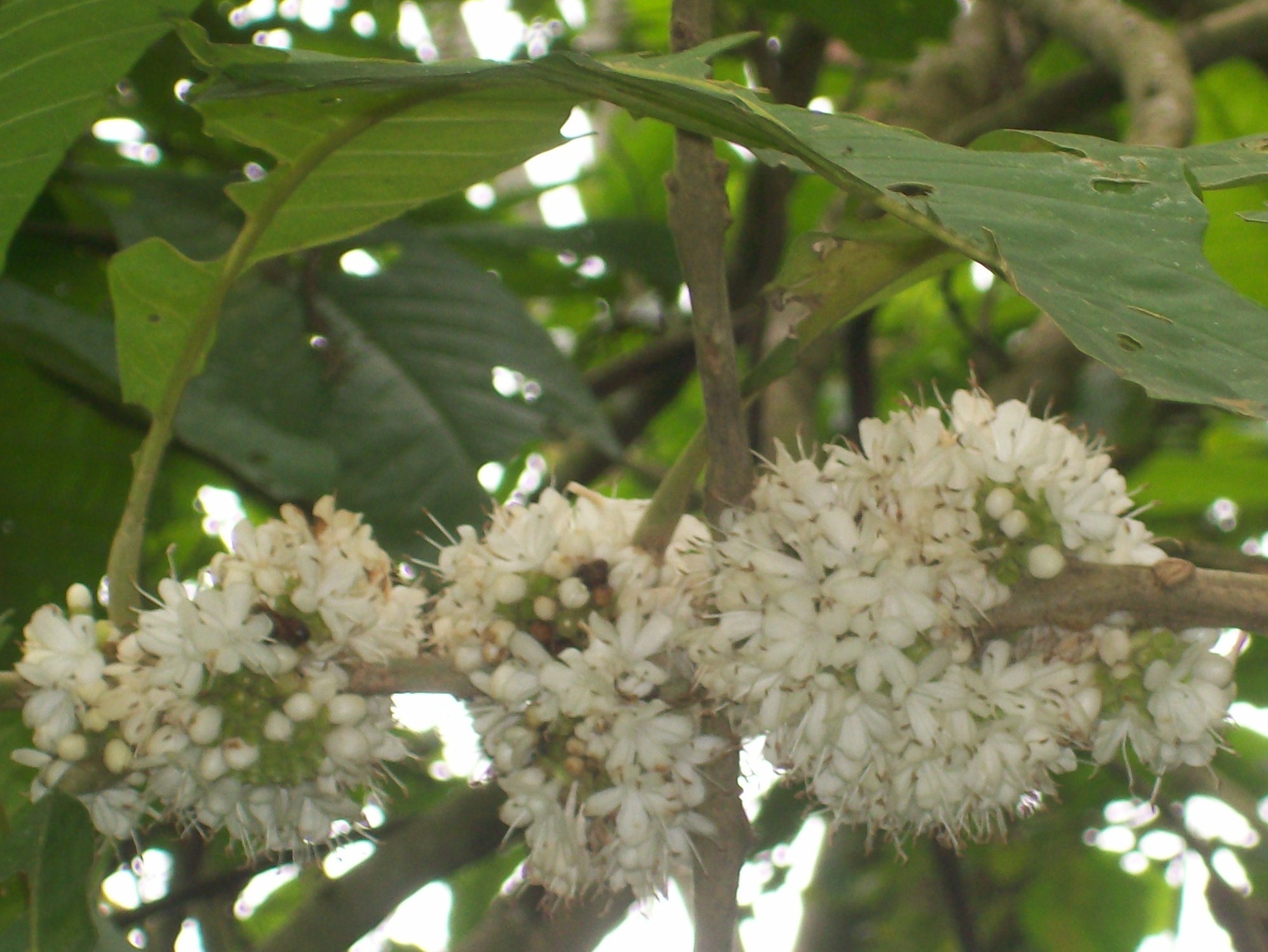 Diesen Baum habe ich vor kurzem, etwa 10 Kilometer im Landesinnere, gefunden. Der Baum ist sicher etwa 10 bis 15 Meter hoch, hat grosse Blätter und diese herrlichen Blüten an den Ästen. Kennt jemand seinen Namen?