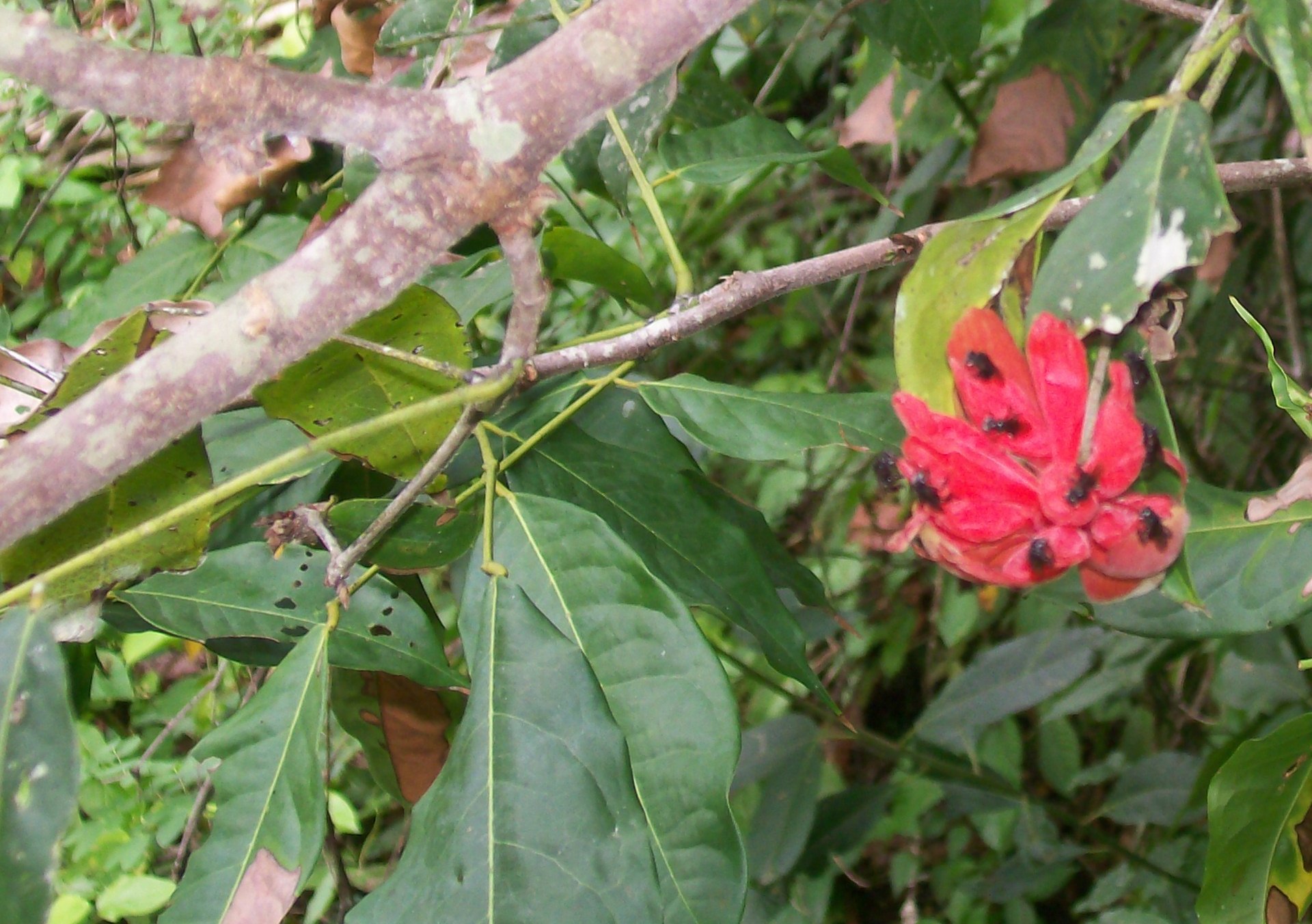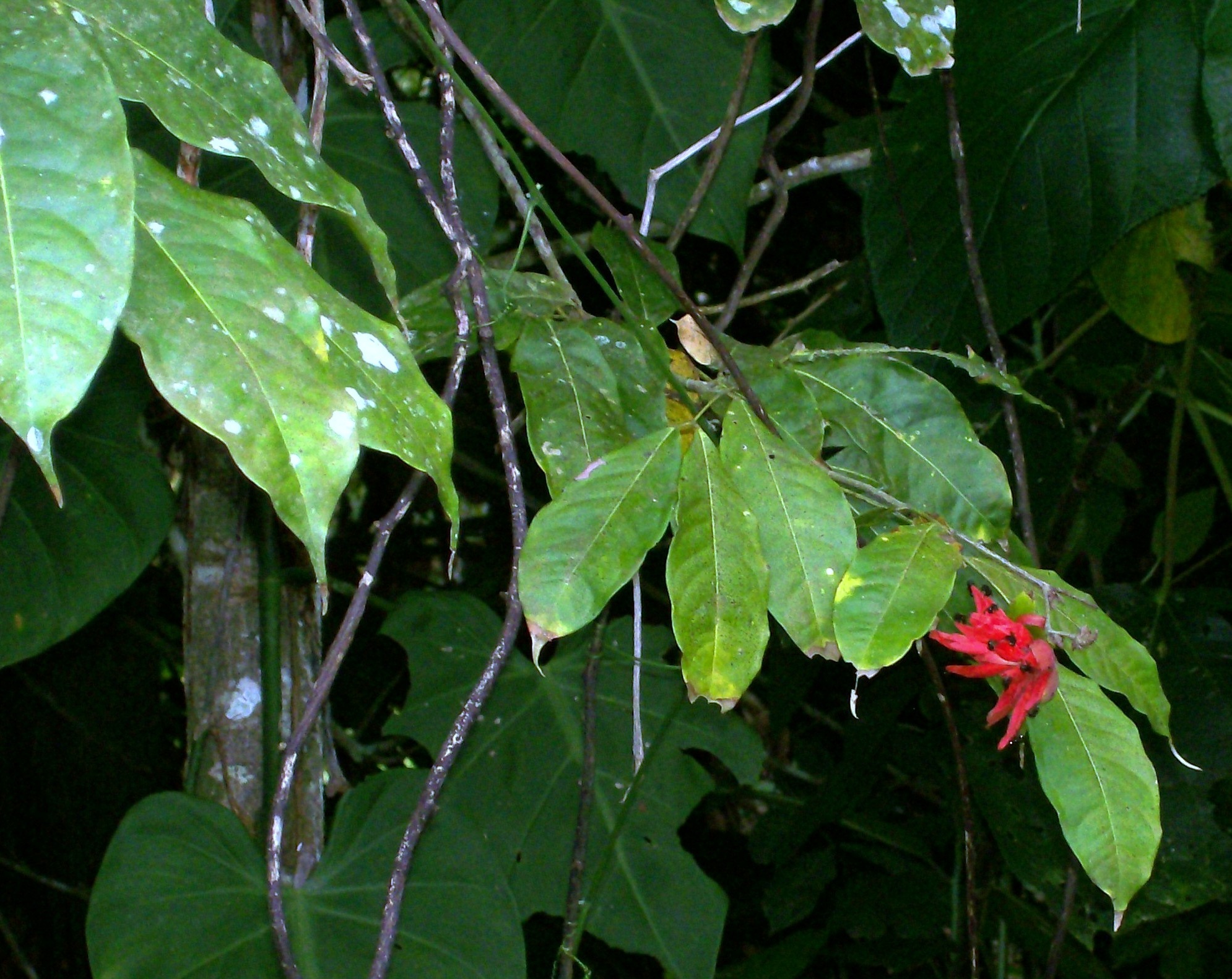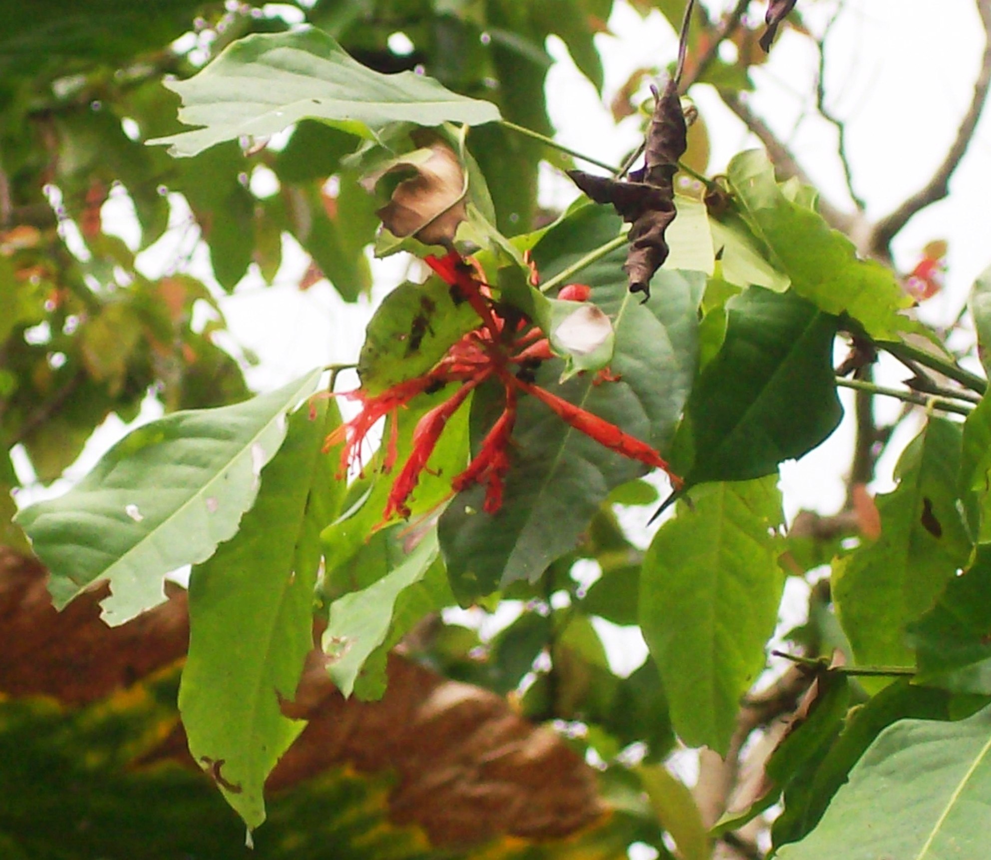 Auch bei diesem Baum wachsen die Blüten, zum Teil, direkt aus dem Stamm. Er steht etwa 15 Kilometer von der Küste entfernt, im Landesinnere. Keine Ahnung, was es sein könnte. Wer hat eine Idee?