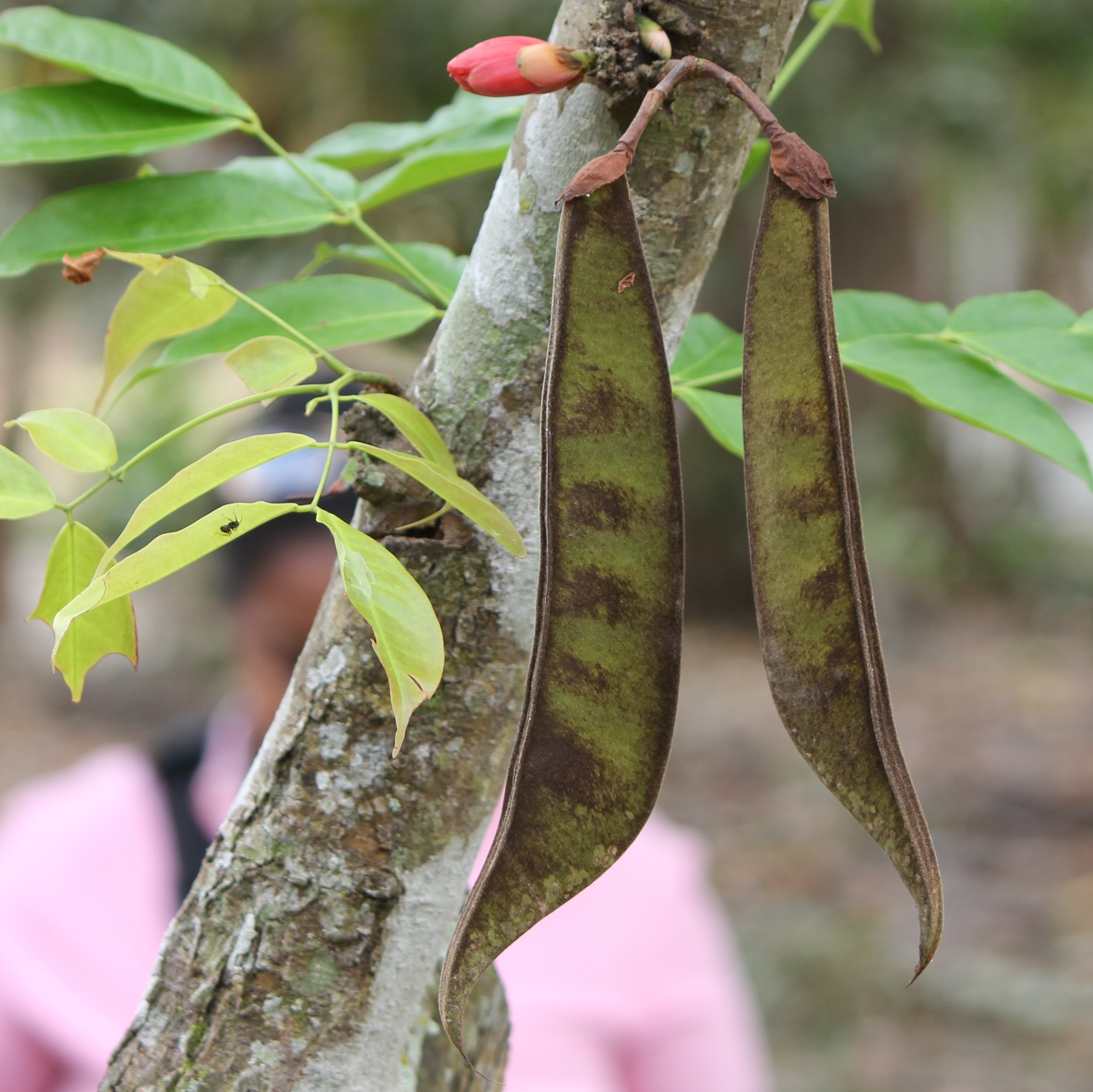 Auch bei diesem Baum wachsen die Blüten, zum Teil, direkt aus dem Stamm. Er steht etwa 15 Kilometer von der Küste entfernt, im Landesinnere. Keine Ahnung, was es sein könnte. Wer hat eine Idee?