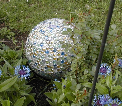 Man nimmt eine alte Gartenkugel aus Ton (vielleicht hat sie ein paar Abplatzer und sieht nicht mehr so schön aus), rührt Fliesenkleber an. Den verteilt man immer stückchenweise auf der Kugel - immer so 10 x 10 cm, glattstreichen und Glasnuggets draufkleben. Trocknen lassen, im Winter reinholen. Vielleicht mach ich mal heute Abend ein Foto davon.