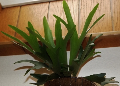 Auch ein Platycerium (Geweihfarn) wächst gern in luftiger Höhe. Meiner steht oben auf einem Schrank und lässt es sich gut gehen. Allerdings bekommt er auch Licht von oben.