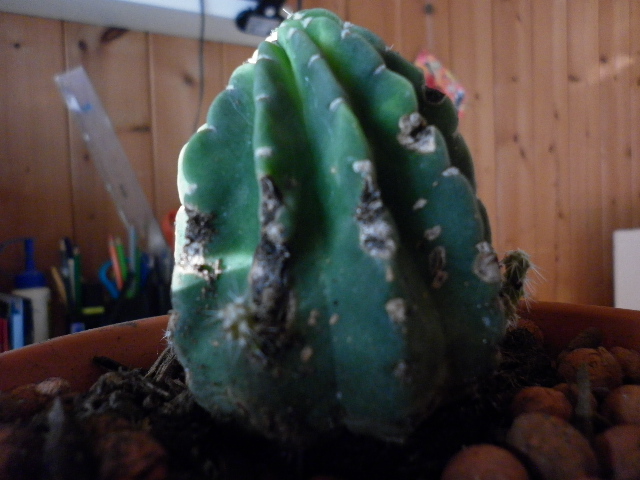 eine Fäulnis wird durch einen Pilz verursacht, und das sieht so aus. Der Echinopsis-Hybride geht es nicht gut, der sieht nach jahrelanger Dunkelhaft aus. Wie pflegst du den und wo steht der? Jetzt sollte er ansich hell bei 10-15° und trocken stehen.