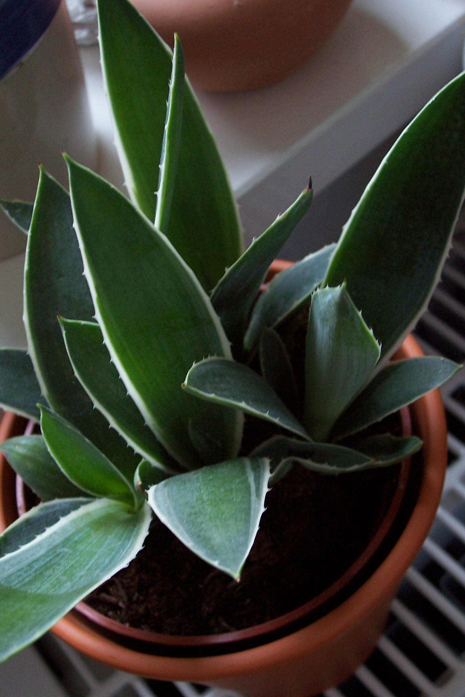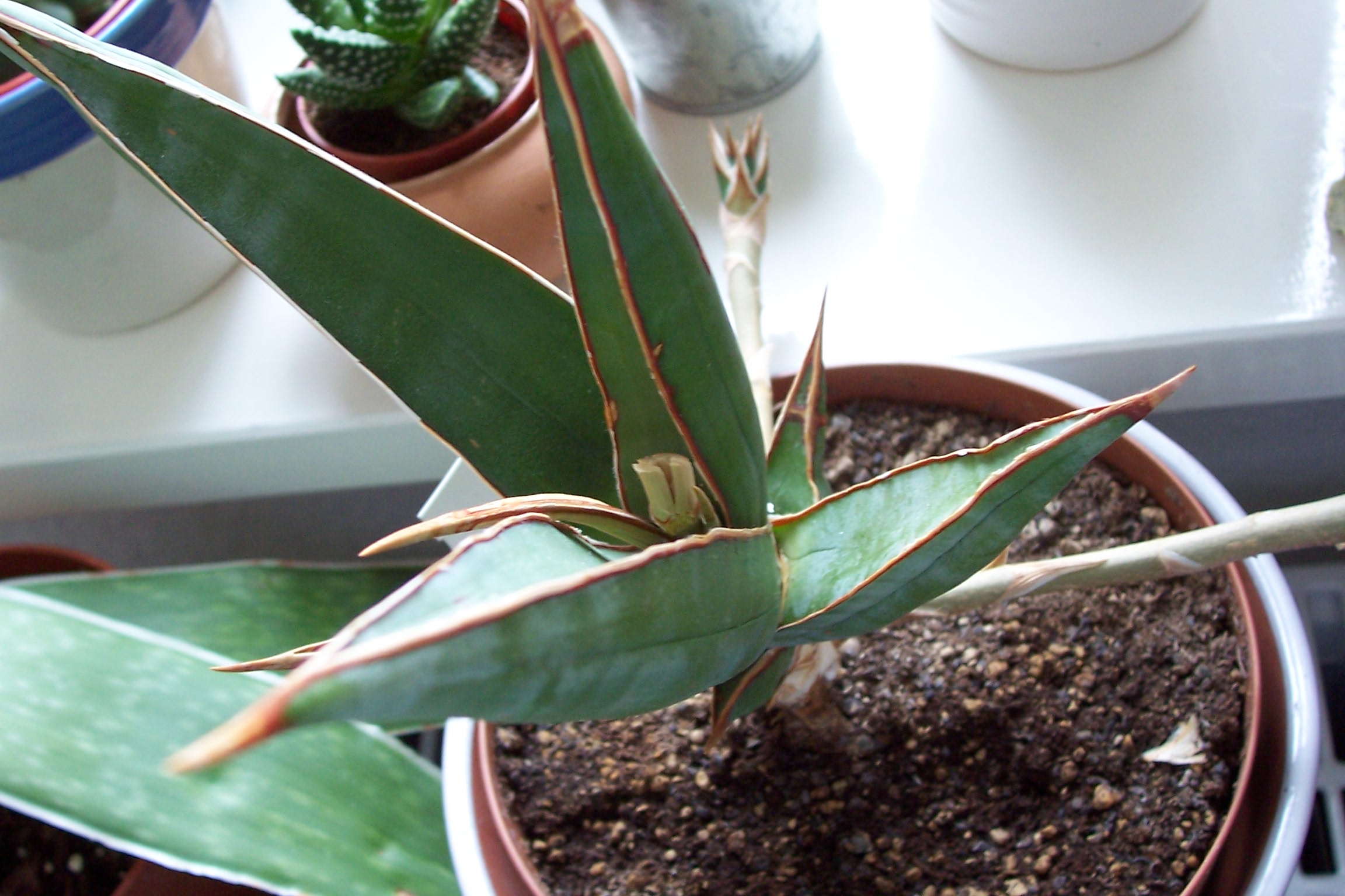 Anbei ein Bild von meiner Sansevieria pinguicula (hoffe richtig geschrieben... )- die hat genauso schlimme Stacheln wie Agaven... und die "Blätter" fühlen sich an wie Holz.