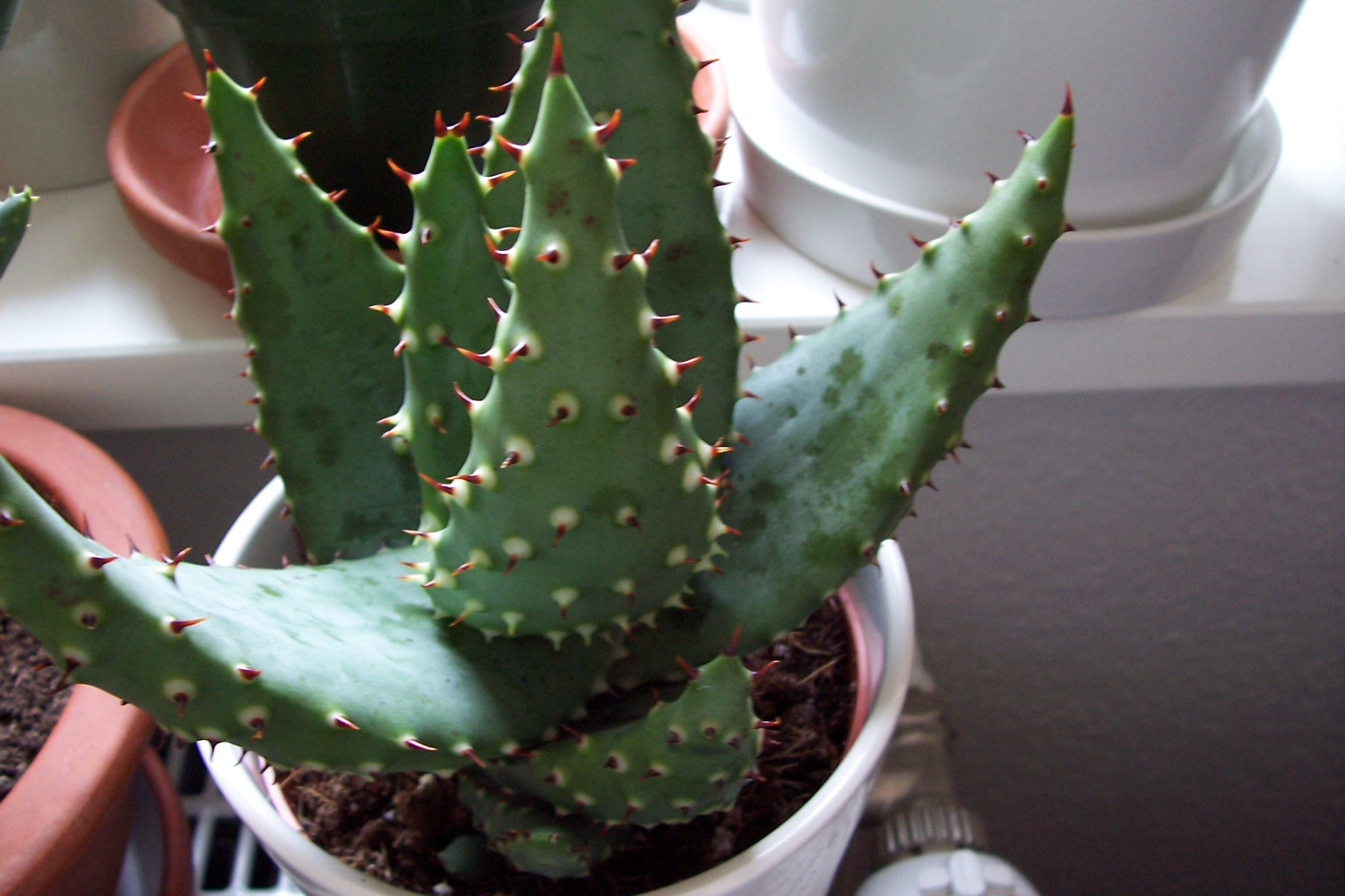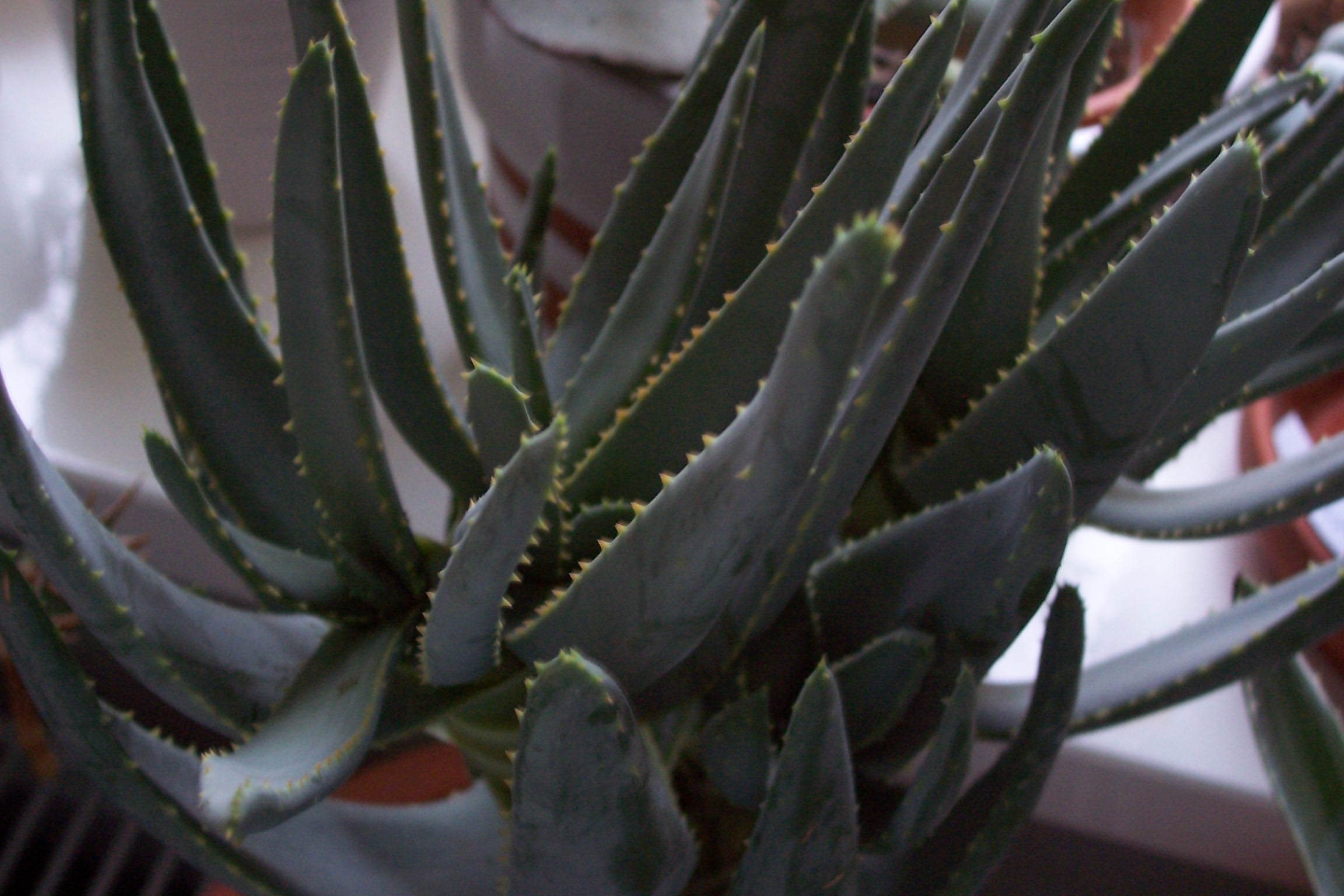 Anbei ein Bild von meiner Sansevieria pinguicula (hoffe richtig geschrieben... )- die hat genauso schlimme Stacheln wie Agaven... und die "Blätter" fühlen sich an wie Holz.