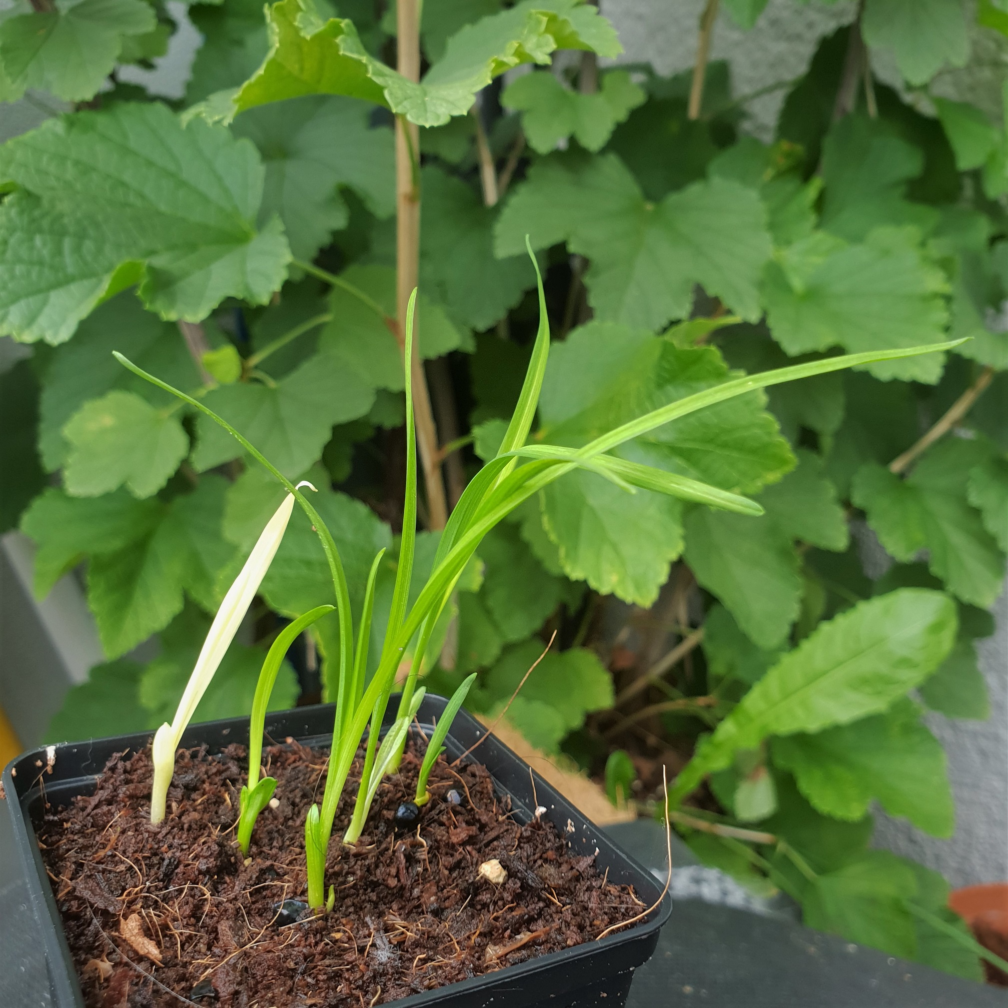 Einer der Tagliliensamen ist nach 24 Tagen gekeimt jetzt, mit vier Tagen, sieht er noch aus wie ein kleiner Grashalm. Ich hatte das Einweichen vor der Aussaat vergessen, vielleicht keimt ja noch einer von den anderen Samen