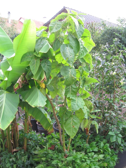 Heute hab ich alle anderen Blütenstände abgemacht, damit sie alle Kraft in die vier Tamarillos steckt. Und paar große Blätter, die die Sonne versperrt haben, mussten auch weichen.