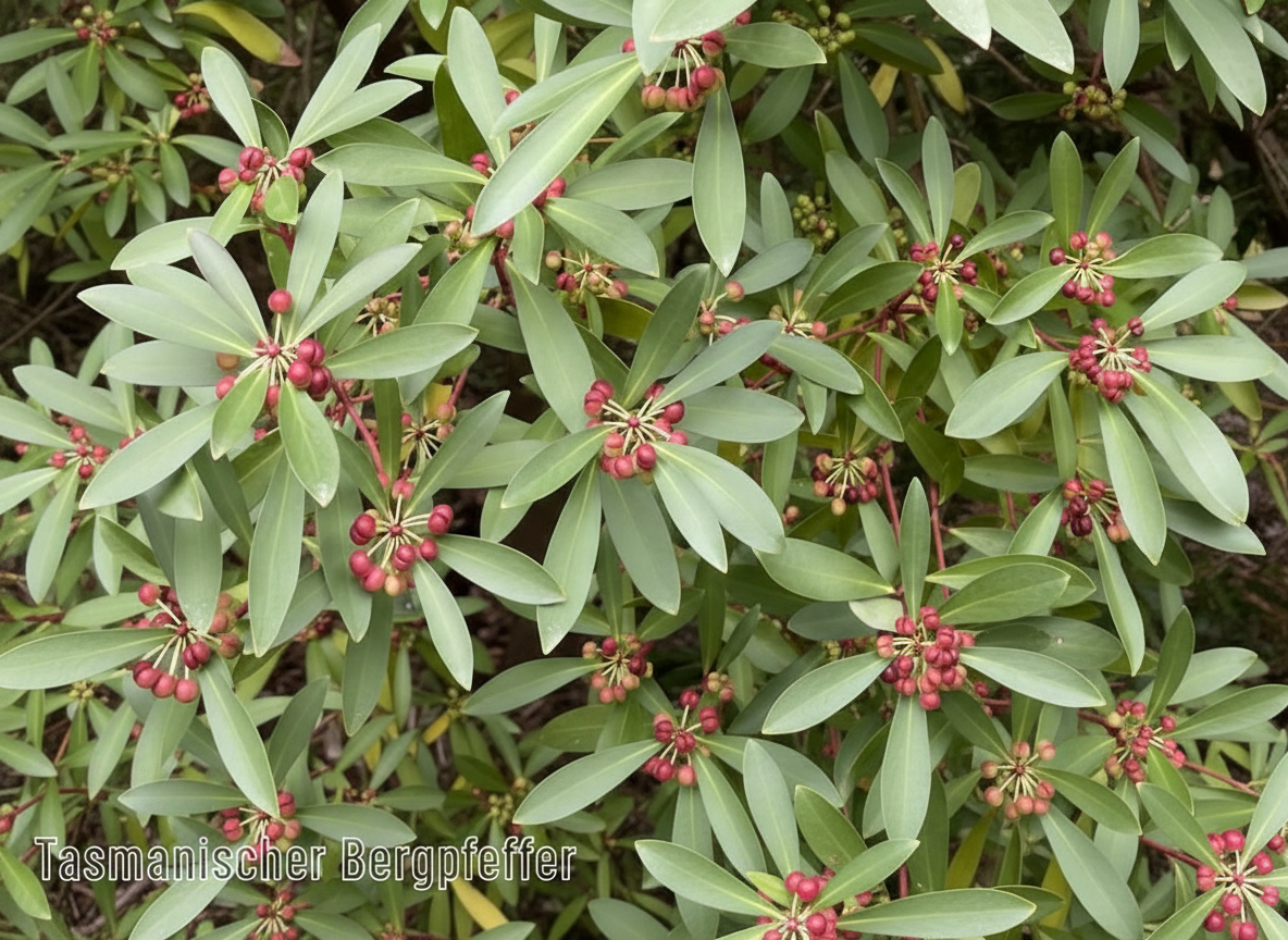 Der Tasmanische Bergpfeffer, auch bekannt als Gewürzrindenbaum, ist ein botanisches Juwel, das die Herzen von Gärtnern und Gourmets gleichermaßen höherschlagen lässt. Dieser immergrüne Strauch aus den kühlen, feuchten Bergwäldern Tasmaniens und Südostaustraliens besticht nicht nur durch seine attraktiven roten Stängel und die eleganten, dunkelgrünen Blätter, sondern auch durch seine kulinarische Bedeutung. Als eine der faszinierendsten "Bushfood"-Pflanzen Australiens liefern sowohl die Blätter als auch die Beeren eine einzigartige, komplexe Schärfe, die in der modernen Küche immer mehr geschätzt wird. Begleiten Sie unser Expertenteam auf einer Reise in die Welt dieses außergewöhnlichen Gewächses und erfahren Sie alles über die erfolgreiche Kultivierung im eigenen Garten oder Kübel.