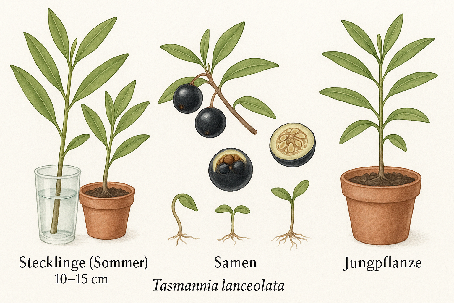 Tasmannia lanceolata erfordert etwas Geduld, ist aber auf zwei Wegen möglich. Die Samenvermehrung ist genetisch interessant, aber langwierig. Die Stecklingsvermehrung ist schneller und sichert die sortenechten Eigenschaften (und das Geschlecht!) der Mutterpflanze.