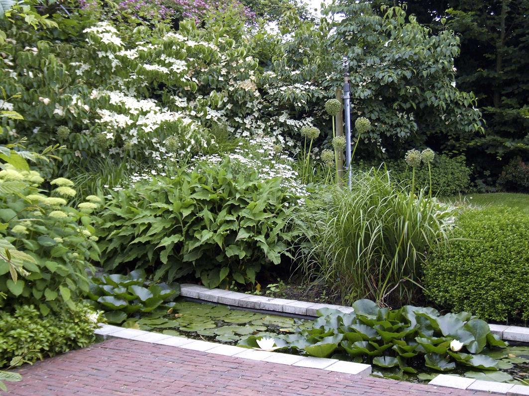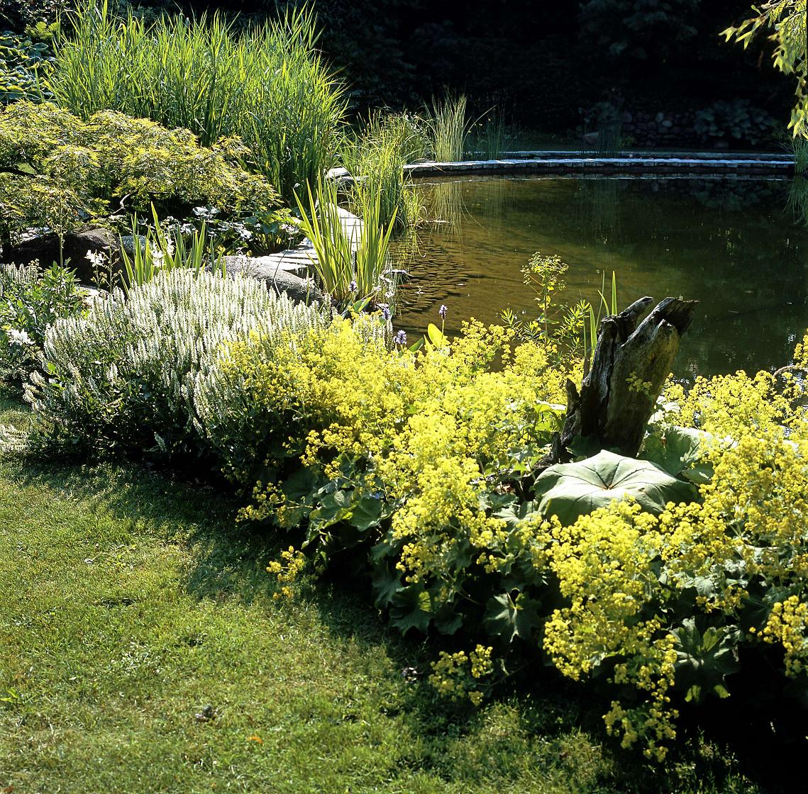 Ob man sich nun für ein streng geometrisches Wasserbecken oder eine natürlich geformte Teichlandschaft entscheidet, hängt letztlich vom Stil des Gartens und seines Besitzers ab. Sind formale Linien durch Haus, Terrasse oder Wegführung vorgegeben, bietet sich eine architektonische Lösung an, die diese Formen wieder aufgreift. Einzelne Wasserpflanzen wie Seerosen Nymphaea oder Rohrkolben Typha ordnen sich hier dem Gartenstil unter, setzen aber Akzente. Wem verspielte und weiche Formen sympathischer sind, der hält sich an die Natur. Denn der naturnahe Teich fasziniert durch sanfte Uferschwünge und unterschiedlich tiefe Wasserzonen. Die Vielfalt der Pflanzen im Wasser und am Ufer sorgt für eine reiche Tierwelt.