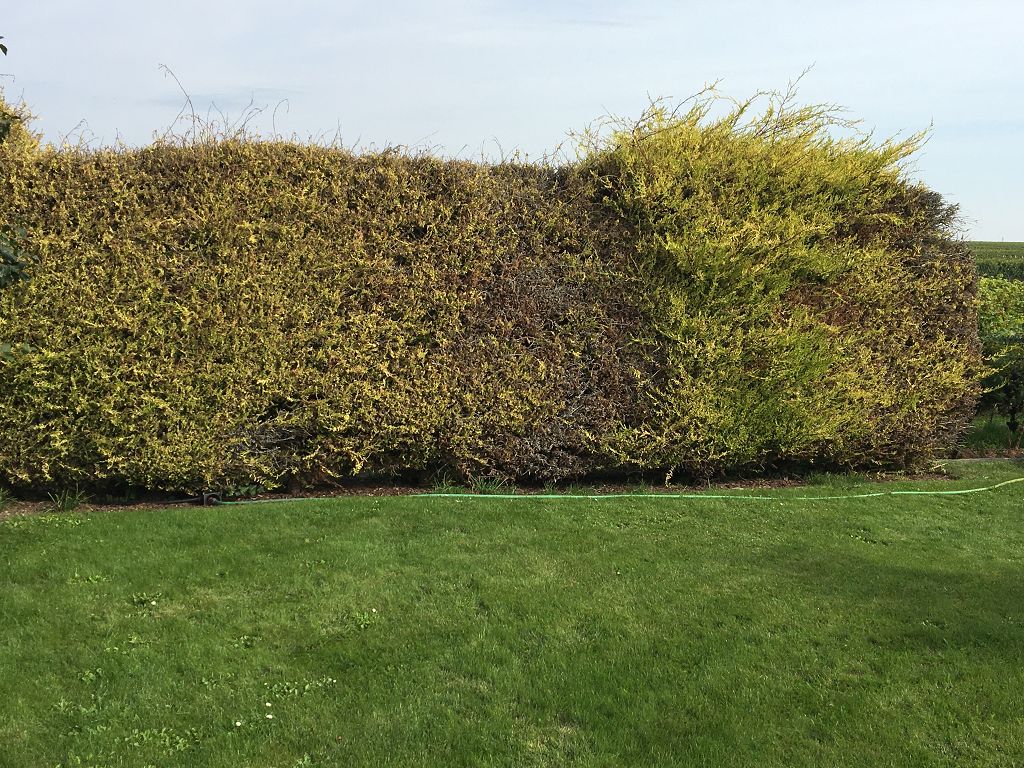 Im Verlauf des nächsten Jahres komplett die Hecke roden mit Maschinenkraft, vorallem die Wurzelstöcke mit roden. Zum Herbst hin dann die neuen Pflanzen setzen und gut wässern!!
