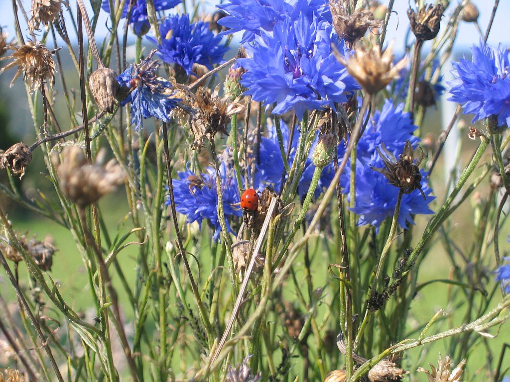 Ich hab das zwar nicht erlebt, aber ich kann mir vorstellen wie traumhaft das ist! Ich habe mir auch extra ein Mohn-Kornblumen-Beet angelegt. Der Mohn ist schon verblüht. Aber die Kornblumen blühen noch ein bisschen. Eine Königskerze wächst auch im Beet sowie Borretsch.