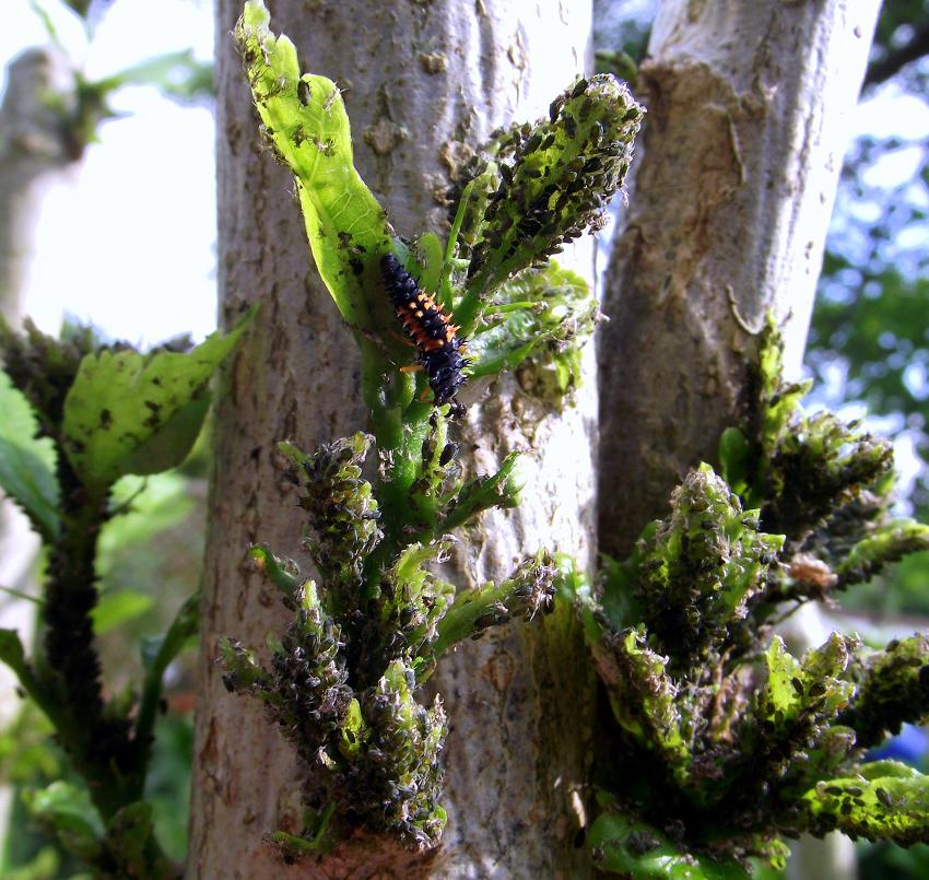 Bei uns beginnt an den Freilandhibisken, die wirklich stellenweiße schwarz vor Läusen sind endlich das Große Fressen.