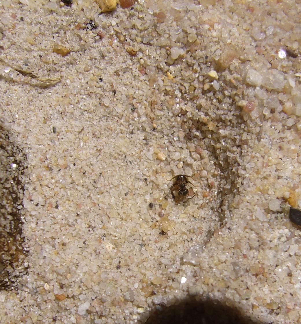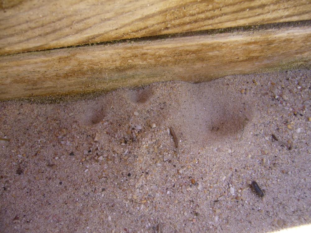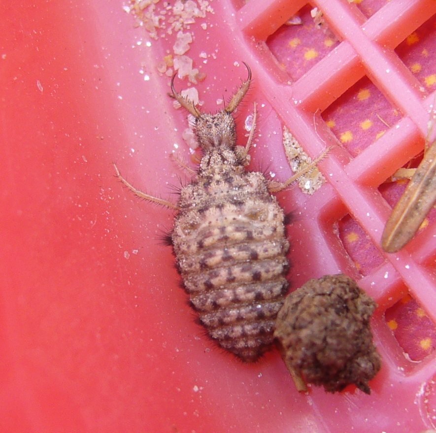 wir haben jedes Jahr wieder an allen überdachten und daher trockenen Stellen Ameisenlöwen. Bisher hab ich immer nur die Trichter gesehen, aber bei der letzten Terrasse-von-Spielsand-befrei-Aktion mit anschließendem Dreck-aus-Sand-sieben ist mir tatsächlich versehentlich einer in's Netz, Verzeihung, in's Sieb gegangen... Nach dem Fototermin durft er weiterbuddeln - hab auch ganz brav wieder Sand neben den Kasten geschüttet