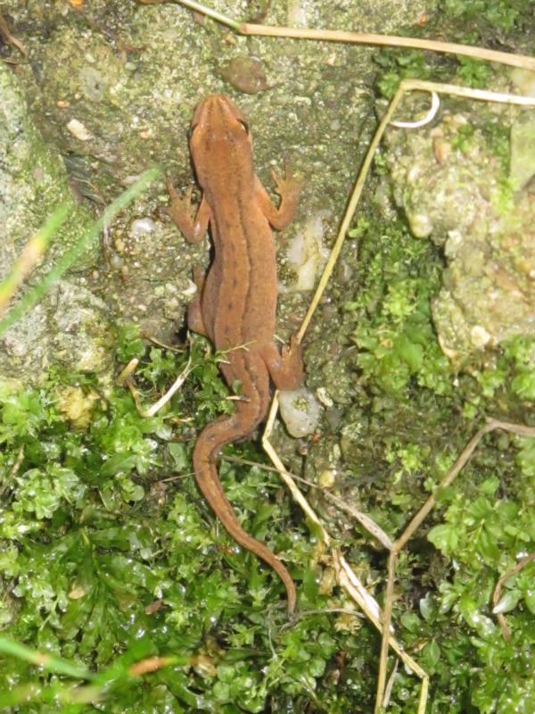 Der Molch ist ein Teichmolch-Weibchen. (Landtracht)