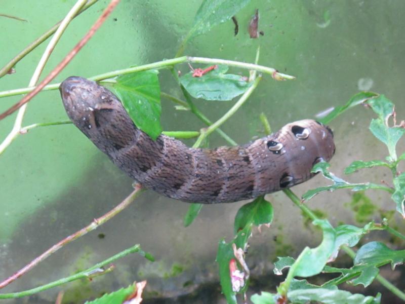 Weinschwärmer verpuppen sich in lockerer Erde oder zwischen trockenem Laub, die man ihnen in das Gefäß geben kann. Die Futterpflanzen stellt man am besten in eine Flasche mit Wasser, damit sie nicht verwelken. Flasche ist besser als ein Glas oder eine Vase, weil sie da ins Wasser kriechen und ertrinken. Damit das nicht passiert, verstopfe ich die Flaschenöffnung immer mit Papier oder Watte. Das Gefäß mit der Raupe (Puppe) muss über Winter der Kälte ausgesetzt werden, weil sonst der Falter zu früh schlüpfen kann. Ein ungeheiztes Gartenhaus ist ideal, weil dort auch kein Regen in das Gefäß kommt. Ein weng Feuchtigkeit macht nix, aber unter Wasser erstickt die Puppe.