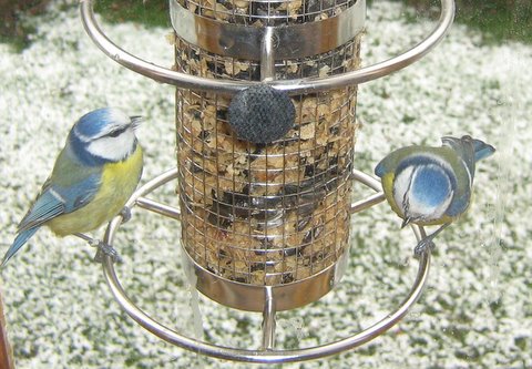 Bisher kamen nur Kohl- und Blaumeisen, aber heute hab ich eine Schwanzmeise gesehen Die erste, die ich je gesehen hab. Leider war sie weg, bis ich die Kamera geholt hatte. Aber im Nachbargrundstück hab ich dann noch eine 2. gesehen, nehme also an, das es ein Pärchen war, was dann zusammen wegflog.
