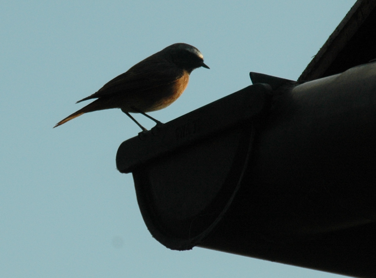 Heute konnte ich vom Schreibtisch aus zusehen, wie dieser Rotschwanz und seine Frau immer wieder Nistmaterial mitbrachten und hinter der Dachrinne in die Verkleidung schlüpften! Als er sich dann in der Abendsonne so schön präsentierte, hab ich ihn "erwischt"...