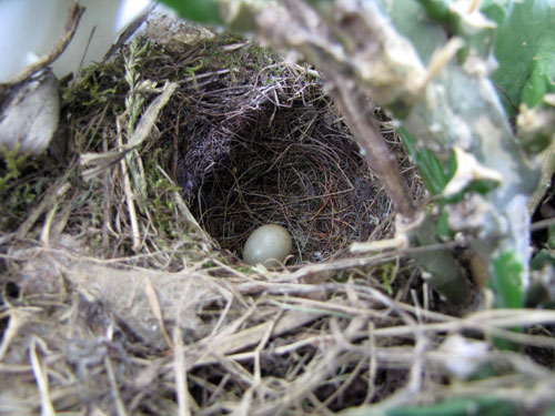 Seit einer Woche steht mein riesiger Topf vom Epiphyllum draußen - leicht erhöht - es dauerte nicht lange und ein Rotkehlchen-Pärchen fing an, ein Nest darin zu bauen. Gestern lag dann das erste Ei drin. Die Eltern sind mir zu flink - die hab ich noch nicht auf's Bild gekriegt, aber der Nachwuchs hält noch still.
