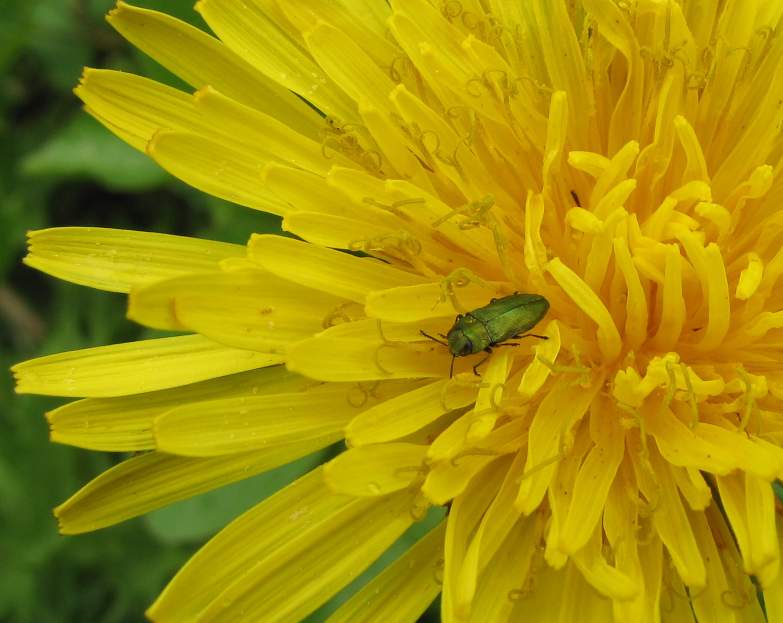 Heute habe ich beim Fotografieren die Kühle geschätzt. Die Insekten ließen mich ganz nah herankommen, so dieser Glänzende Blütenprachtkäfer (Anthaxia nitidula) auf der Blüte vom Löwenzahn. Das hübsche Kerlchen ist nur 7mm lang und ließ sich nicht stören von der Kamera.