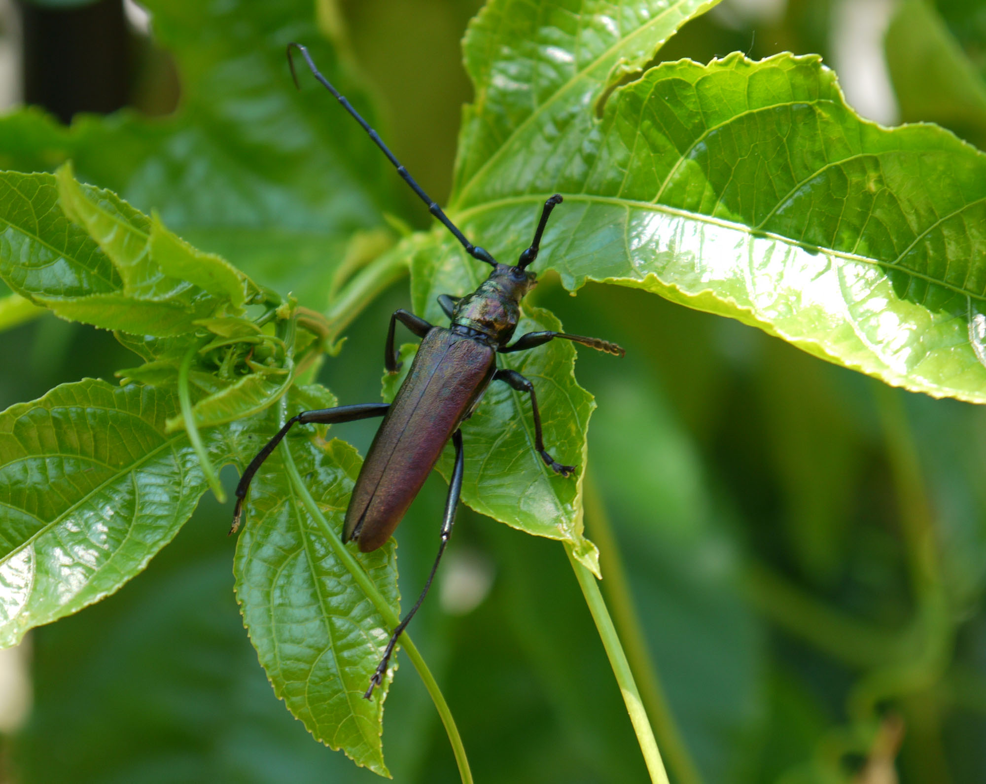 anscheinend einer der größeren exemplare, war gut 4cm lang und mit fühler glatt mal dopeltsogroß. schön in der sonne schillernd. bewegte sich etwa unbeholfen auf einem jungtrieb, aber der arme kerl war wohl auch etwas eingschränkt.
