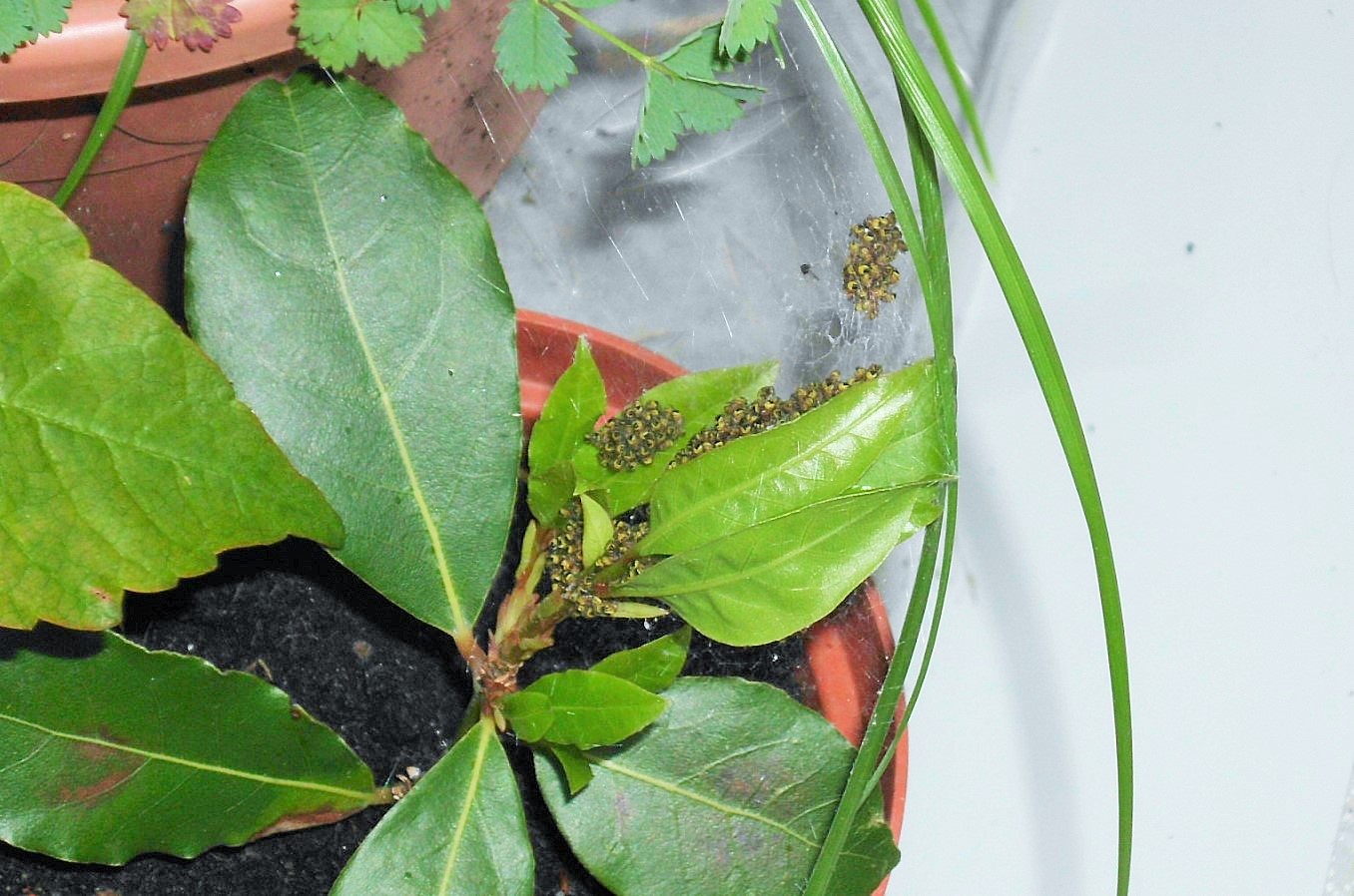 Ich hoffe, ich darf mich auch ohne Garten einmal dazwischen mogeln..die Knubbel an meinem kleinen Lorbeer sind mir vorgestern das erste Mal aufgefallen, aber ich hatte nicht die Zeit und den Nerv näher zu schauen. Ich dachte flüchtig an alte Blätter, Erde oder so etwas in der Art
