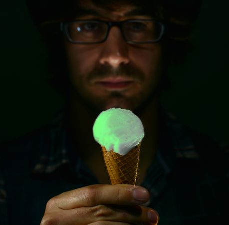 Schon oft gesehen: Es gibt Quallen die in der Dunkelheit leuchten. Für das Leuchten ist ein Kalzium-aktiviertes Protein verantwortlich. Daraus lässt sich auch Speiseeis herstellen, das dank dem Temperaturunterschied des Mundes zu leuchten beginnt. Dies ist Blödsinn? Nicht ganz, Charlie Francis Harry, ein Nahrungswissenschaftler hat das Speiseeis erfunden und versichert Feinschmeckern, dass der Verzehr unbedenklich ist.
