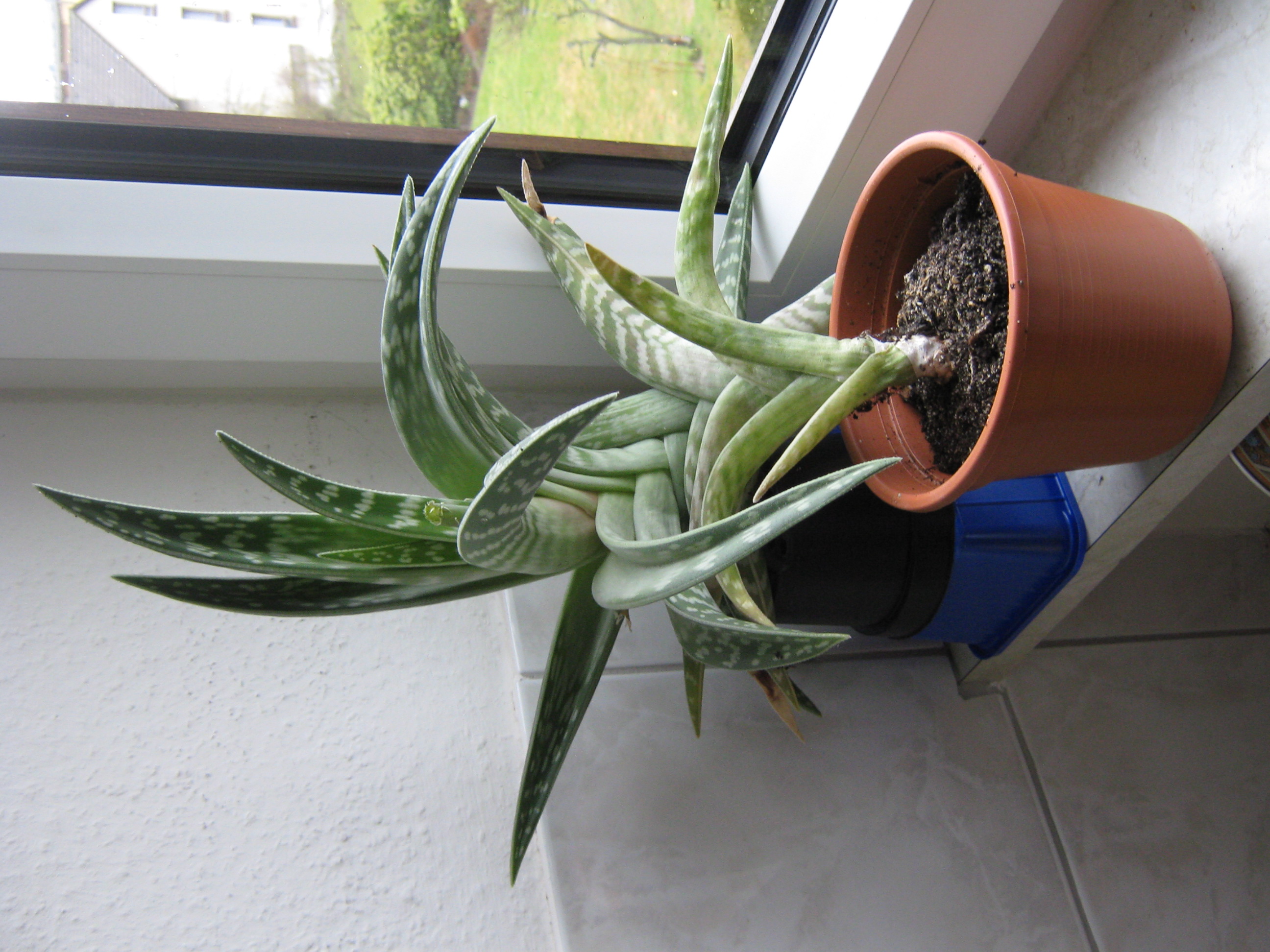Ich habe sie vor einigen Jahren aus einem Blatt einer verfaulten Aloe gezüchtet. Irgendwann wurde sie immer schiefer, unten blieb sie schmal, oben bildete sie immer mehr und immer größere Blätter. Entsprechend wurde die Standfestigkeit noch schlechter. Ich habe dann versucht, sie nochmal umzutopfen und möglichst gerade in den Topf zu setzen. Allerdings konnte die Erde das Gewicht nicht halten und so stand sie wieder schief und ich habe Töpfe darunter stellen müssen, um den unteren Bereich zu entlasten. Aber gestern hat sie sich mal wieder selbstständig gemacht...