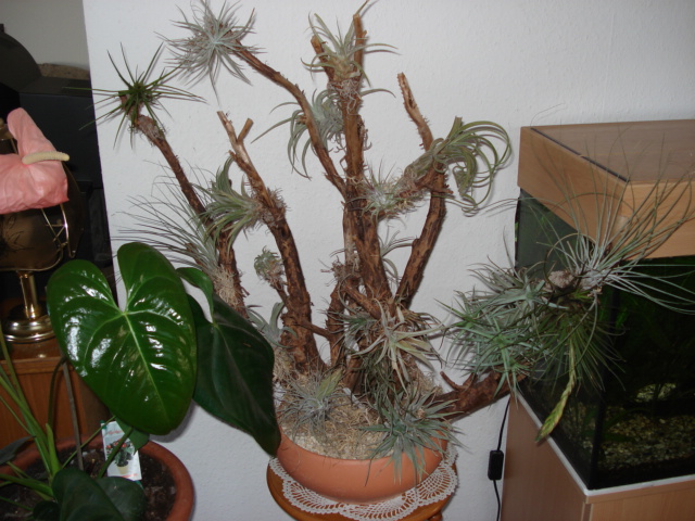 wir haben einige tillandsien hier. wenn man kakteen und orchideen hat, kommt man wohl zwangsläufig auch auf tillandsien. erst hatten wir einige wenige, dann entwickelte sich das zu einem "tillandsienbaum" und später zum tillandsiengitter. dabei sind wir hier auf keine fall fachleute. uns gefallen die einfach und wir legen auch überhaupt keinen wert darauf, die einzelnen sorten genau bestimmen zu können. beim tillandsiengitter ist übrigens hinter den pflanzen eine glasscheibe in den rahmen eingeschoben, damit beim sprühen die wand nicht nass wird.