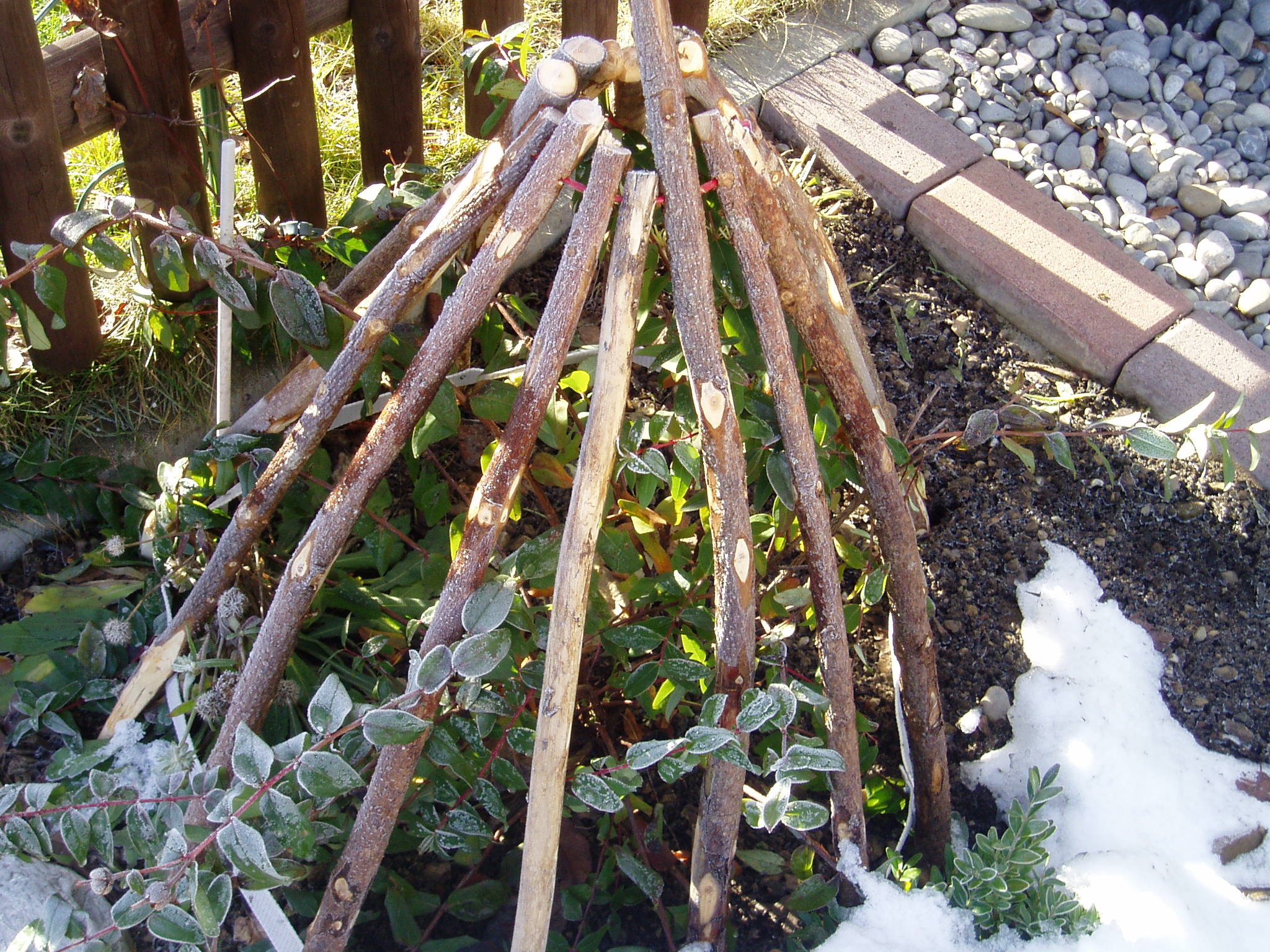 Letztes Jahr hat GG beim Schneeschaufeln die Zweige meines Lieblingsstrauches `Johanniskraut´ mehrfach abgebrochen. Der Strauch ist noch recht jung. Damit das diesen Winter nicht wieder passiert, hat er mir ein TIPI gebaut. Die Konstruktion ist einfach, aber wirkungsvoll. Die Schneemassen (vom Schaufeln) können meinem Strauch nun nichts mehr anhaben. Bewährungsprobe bestanden