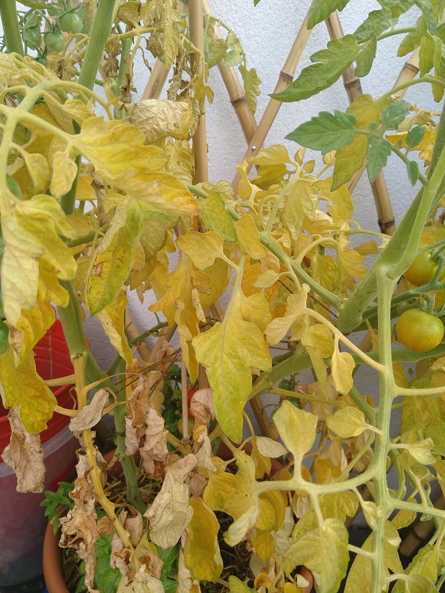 Angefangen haben sie an der verdelten Mini-San Marzano, jetzt sind alle Pflanzen betroffen. Beim Standort handelt es sich um einen sehr (!) sonnigen Südwestbalkon. Dieses Jahr ist es besonders heiß und trocken. Die Pflanzen haben daher zusätzlich auch alle mit Spinnmilben zu kämpfen, die befinden sich aber eher im oberen Bereich und werden bereits mit Neem und Nützlingen bekämpft. Die gelben und welken Blätter finde ich eher unten.