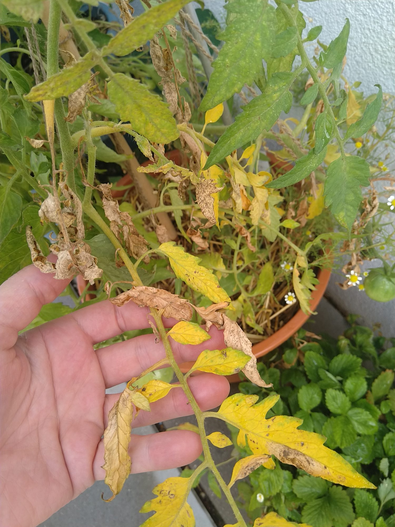 Angefangen haben sie an der verdelten Mini-San Marzano, jetzt sind alle Pflanzen betroffen. Beim Standort handelt es sich um einen sehr (!) sonnigen Südwestbalkon. Dieses Jahr ist es besonders heiß und trocken. Die Pflanzen haben daher zusätzlich auch alle mit Spinnmilben zu kämpfen, die befinden sich aber eher im oberen Bereich und werden bereits mit Neem und Nützlingen bekämpft. Die gelben und welken Blätter finde ich eher unten.