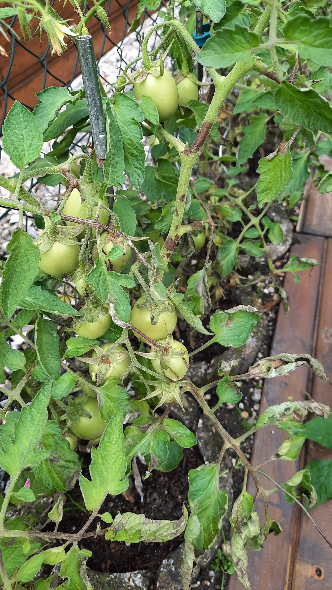 Leider gab es jetzt bei uns so viel Regen und es ist relativ frisch, sodass ich befürchte, dass sich meine lieben Tomaten langsam verabschieden... Sie stehen ohne Überdachung in Pflanzsteinen, was ihnen über die vielen Jahre sehr gut bekommen ist. Heuer aber - das Wetter ist sehr suboptimal :'( Wobei es sehr seltsam ist, dass bei den Nachbarn die Tomaten mit einem kleinen Dach drüber und sogar die im Gewächshaus eine ähnliche Krankheit haben. Jedenfalls befürchte ich das Schlimmste und der Regen ist wohl auch noch nicht vorbei in den nächsten Tagen :(