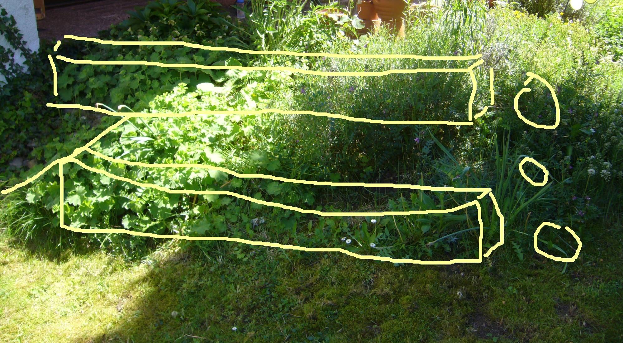 Trotzdem gibt's zwei Probleme. Auf der einen Seite enden die Mauern an der Hausdrainage. Hier könnte die Mauer über die Drainage bis zur Hausmauer fortgeführt werden, aber das überzeugt mich genauso wenig, wie sie einfach "in der Luft" enden zu lassen und damit die 40cm oder wie breit die Drainage ist als Lücke zwischen Mauer und Hauswand zu haben. Zum anderen soll das Beet an der anderen Seite begehrbar werden - nur ein paar Trittsteine oder ähnliches, das nimmt nicht viel Platz weg und man kann trotzdem direkt hoch, ohne immer rund um die Terrasse rum laufen zu müssen wie bisher... Allerdings müssten die Steine ziemlich direkt neben die Mäuerchen, weil man sonst an einer großen Blaufichte hängen bleibt... geht das, oder gibt das Schwierigkeiten?