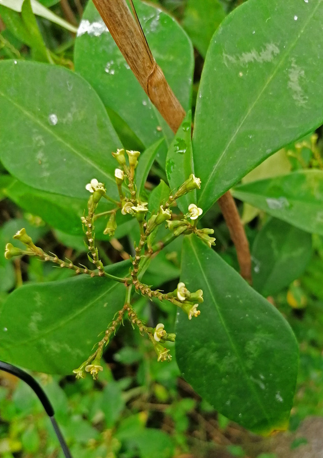 Vielleicht kann mir jemand weiterhelfen bei der Namensfindung eier hier abgebildeten, rankenden Pflanze, die in einem Tropenhaus mit Euphorbia tuberifera (Angola) tituliert war. Der Artname stimmt sicher nicht. Der Familienname könnte jedoch zutreffen, da Stiele und Blätter Milchsaft führen. Unter den Wolfsmilchgewächsen habe ich bisher keine gefunden, die der hier abgebildeten gleicht.