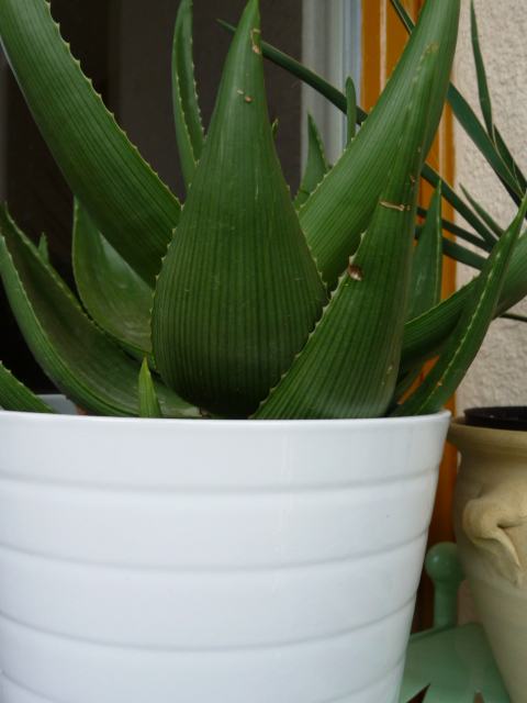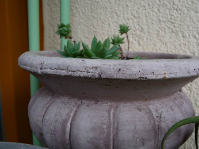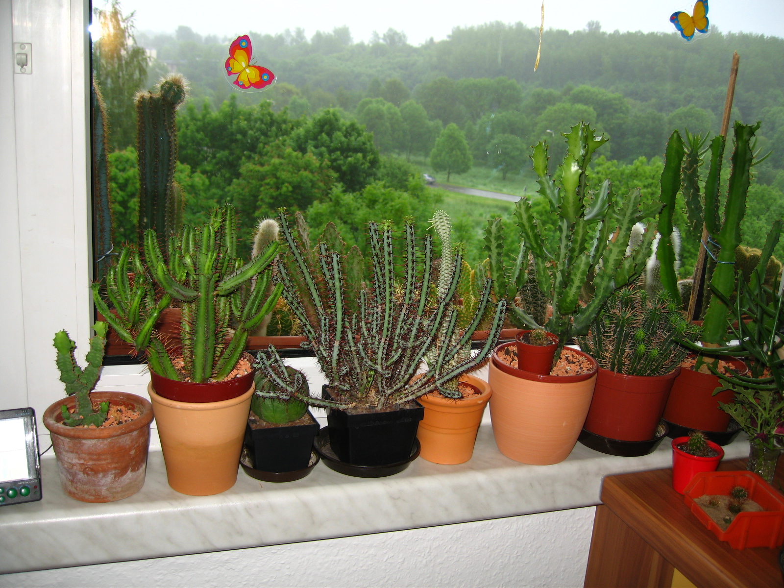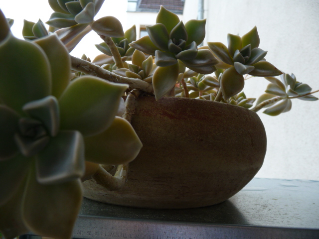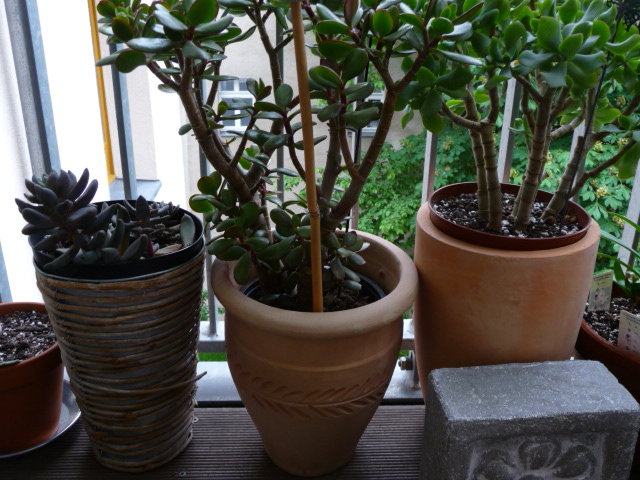 In der Küche habe ich hauptsächlich Terracotta-Übertöpfe, damit meine Euphorbien einen sicheren Stand haben.