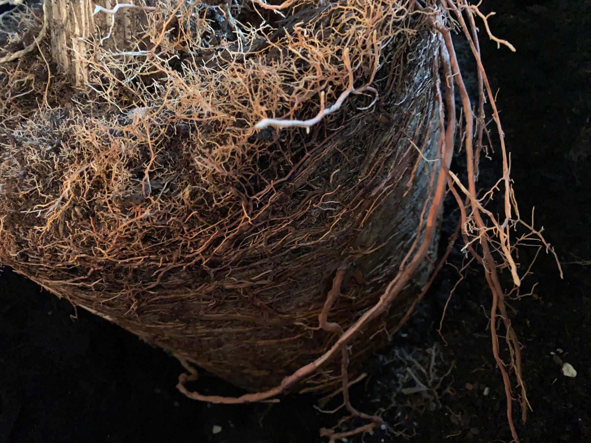 Der Topf war quasi komplett durchwurzelt und es haben sich sehr lange (leicht rötliche) Ringwurzeln gebildet. Fotos kann ich gerne nachreichen. Der Baum liegt seit gestern Abend auf der Seite und ich will Ihn eigentlich im Laufe des Tages umgetopft haben.