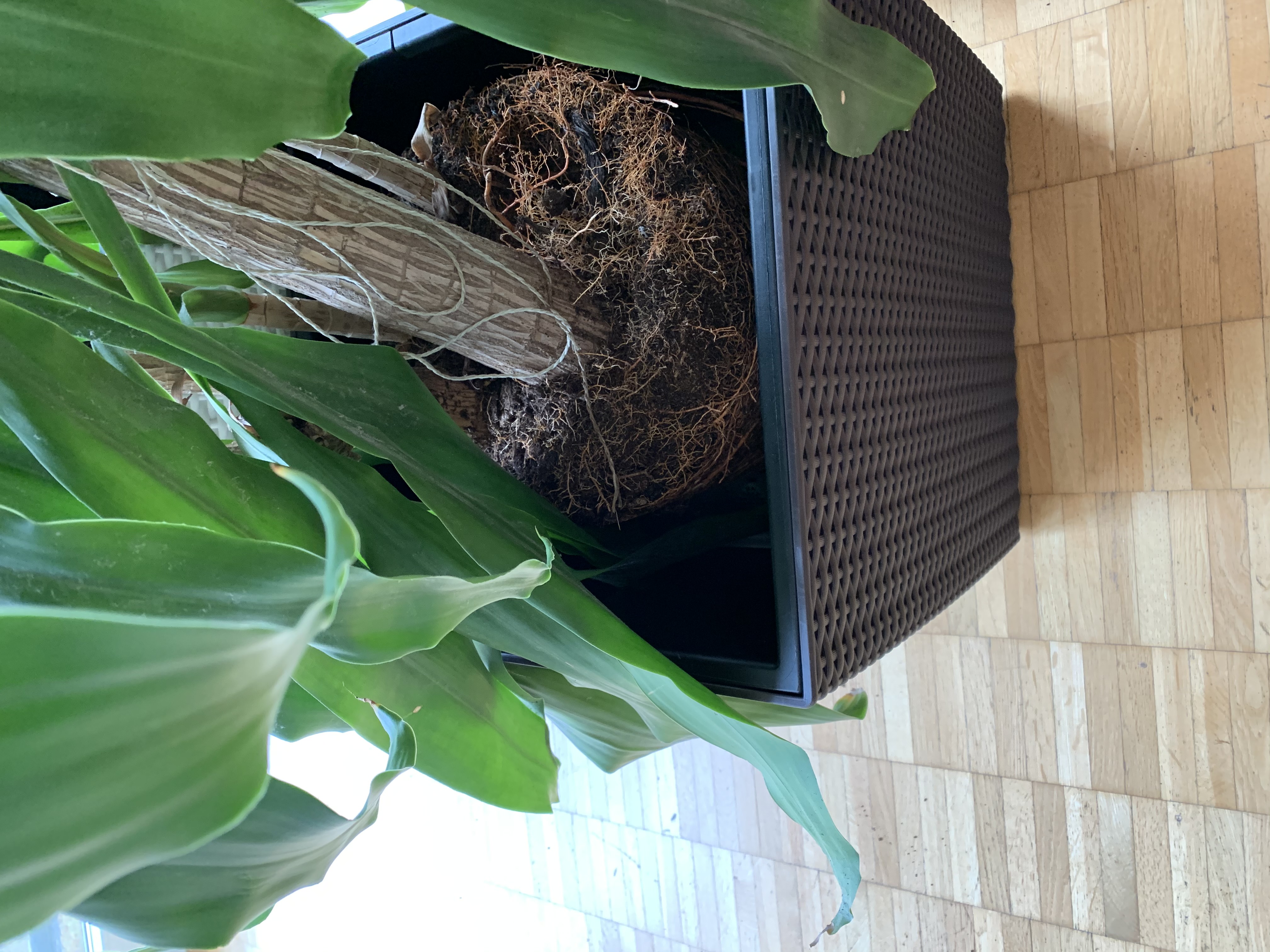 Die Frage bei der Pflanze ist ob die nicht in absehbarer Zeit zu hoch für die Wohnung wird. Falls ja, dann müsste man sich eine ganz andere Lösung überlegen nämlich die Hälfte kappen, den oberen Teil bewurzeln und vom unteren Teil den Wurzelballen verkleinern.