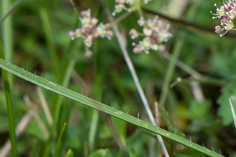 Bei der Aufname einer mir nicht bekannten blühenden Pflanze, ist ein wehrhafter Grashalm mit aufs Bild gekommen. Das Gras hat wie die Brennnessel spitze (Brenn)-Haare. Sie scheinen sogar die bei Brennnesseln typische Bruchstellen zu haben. Kennt einer den Namen dieses Grases?