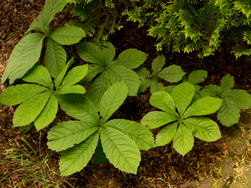 Ca. April/Mai schiebt sich an einem Stengel (ca. 30-40 cm lang) eine sternförmige Anordnung von Blättern aus der Erde, Durchmesser bis zu 40 cm, ein einzelnes Blatt kann gut 20 cm lang werden. Schaut bissl aus wie ein Kastanien-Blatt. Im Herbst verwelkt es dann, ob es eine Blüte dazwischen gibt, weiss ich nicht.