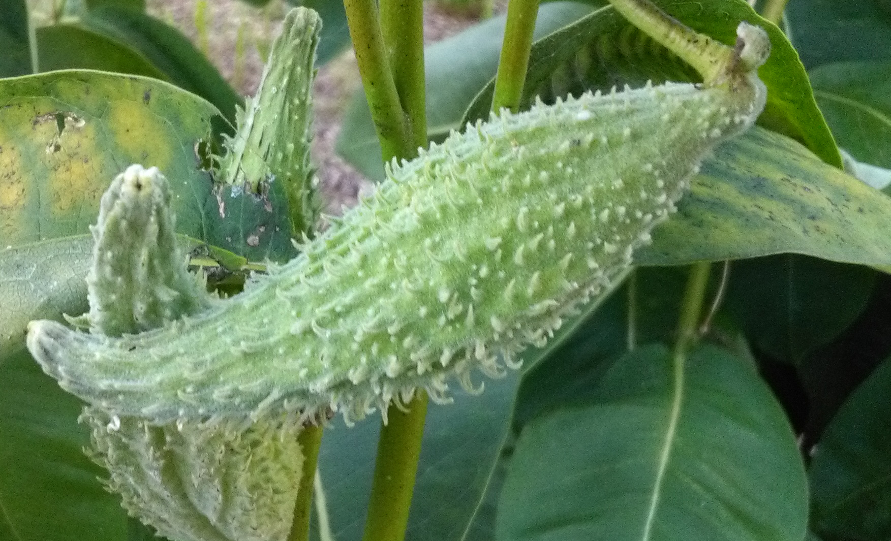 stehz in Teltow-Fläming, Brandenburg im Garten, wird bis zu 120 cm hoch, vermutlich noch größer, wenn man sie ließe. jeweils einzelne Stiele mit vielen Blättern, wenigen Verzweigungen und diesen großen rurkenförmigen Früchten?