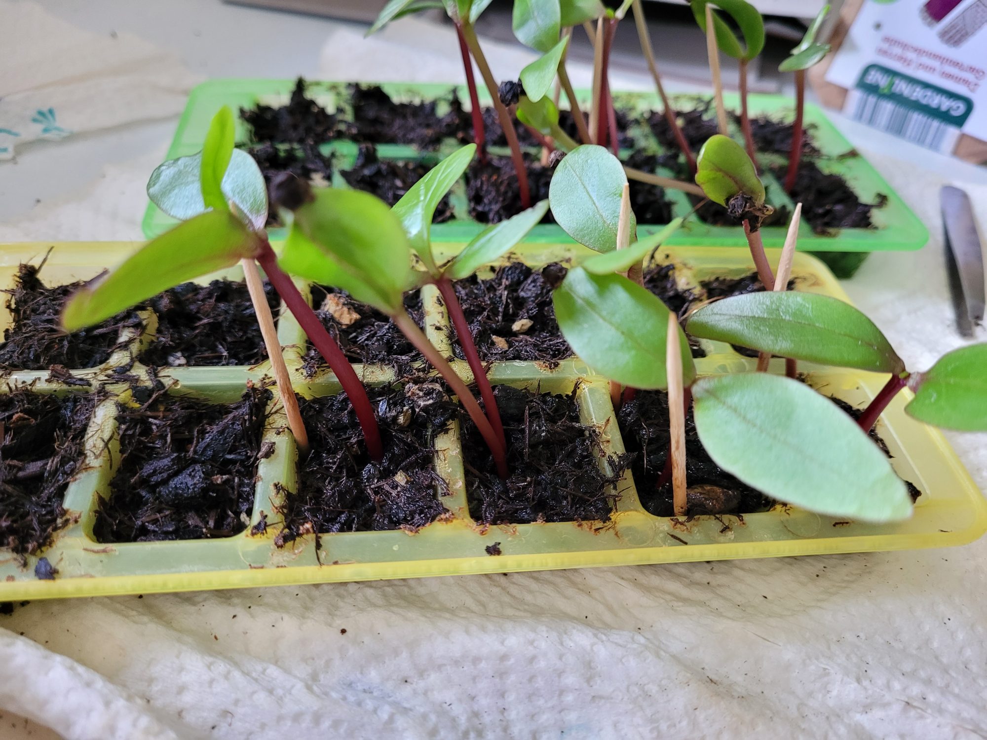 Angehängt zwei Fotos, Zahnstocher for scale. Ein Samenkorn hängt auch noch an einem Sämling.